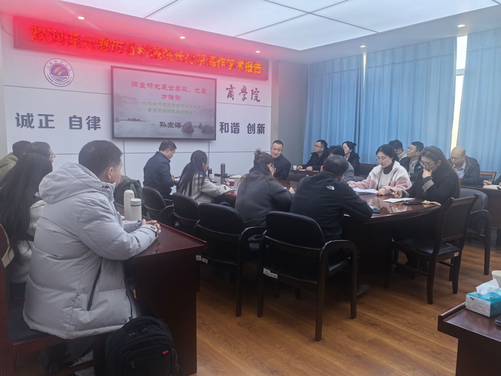 11月26日下午,连云港市社会科学院院长、党组书记孙京海应邀到商学院作题为“如何撰写决策咨询报告”的学术讲座。讲座由商学院院长孙军主持,学院相关领域教师与科研人员参加了本次报告。