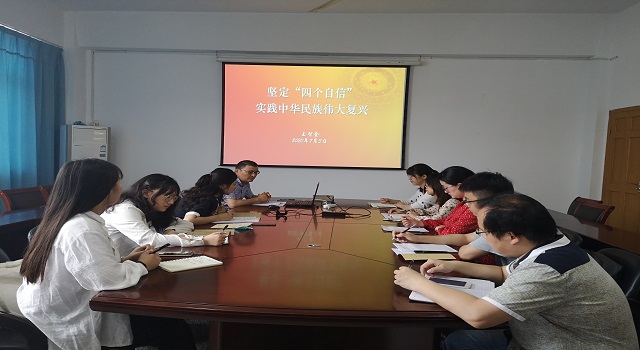 2020年7月3日下午3点,商学院工商管理专业学生党支部于文渊楼355开展以“坚定‘四个自信’,实现中华民族伟大复兴”为主题的支部书记上党课活动。支部书记王智金、刘锦芳同志、叶舟同志等8名支部成员参与了此次活动。