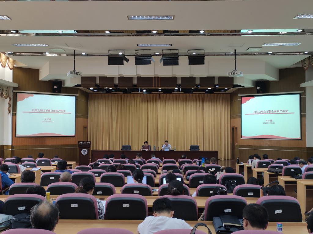 为深入学习贯彻全面从严治党新要求,夯实广大教职工政治理论基础,一以贯之推动全面从严治党,9月16日下午,商学院联合电子工程学院邀请校党委理论宣讲团成员、校纪委副书记汪守建作题为“一以贯之坚定不移全面从严治党”的专题报告。报告会由商学院党委书记杨天华主持,两院教职工140余人聆听了报告。