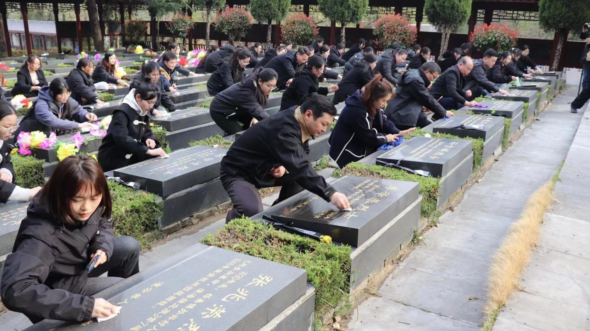活动进入最后阶段,全体人员移步至烈士墓园。大家在行礼默哀后擦拭墓碑,并献上鲜花,依次排队为墓碑描红,表达对烈士们的敬仰与怀念。每支鲜花、每支毛笔都寄托着对烈士的深深哀思和崇高敬意。最后学生们还自发地清扫杂草等,以实际行动维护烈士陵园的整洁与庄严。
