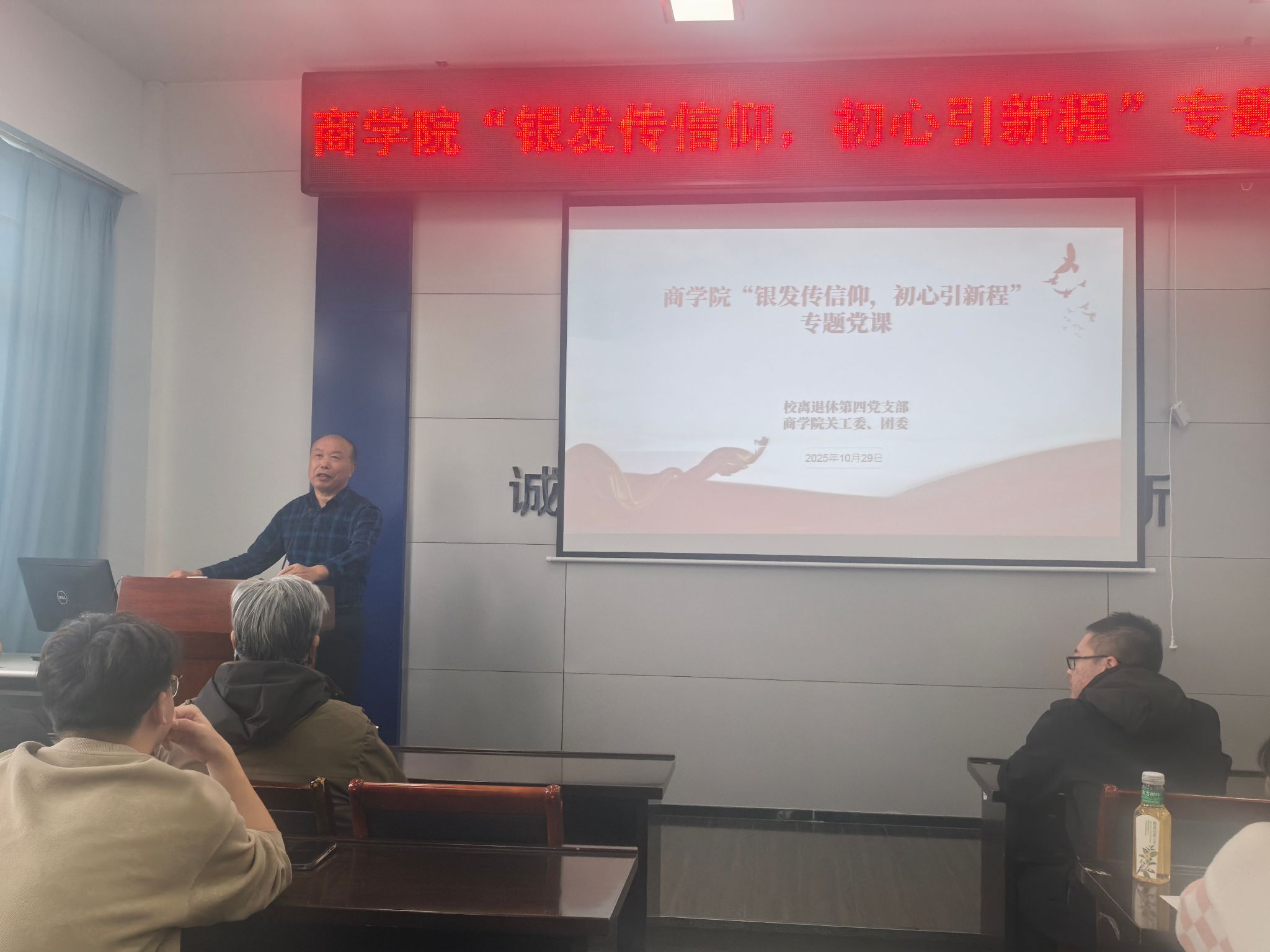 10月29日,商学院关工委联合校离退休处党委第四党支部共同开展“银发传信仰,初心引新程”专题党课学习。本次党课由商学院关工委副主任徐永其教授主讲,离退休党委第四党支部老教师代表、商学院学生代表共同参与学习。