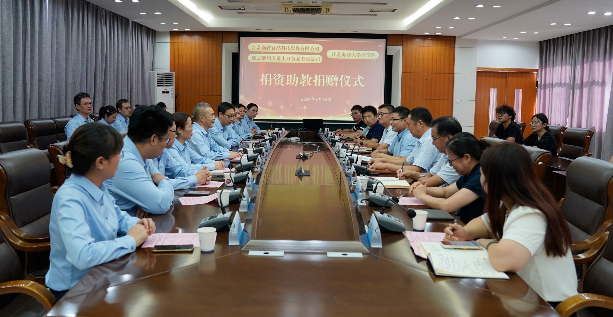 为了推动产教研融合发展,探索建立校企合作新模式,商学院于9月18日下午在文渊楼会议室举行江苏润普食品科技股份有限公司捐资助教捐赠仪式。出席本次的会议嘉宾有校党委常委、副校长朱国军、商学院全体院领导、国贸系师生代表,以及江苏润普食品科技股份有限公司、连云港润天进出口贸易有限公司潘如龙董事长一行。仪式由商学院党委书记万金店主持。