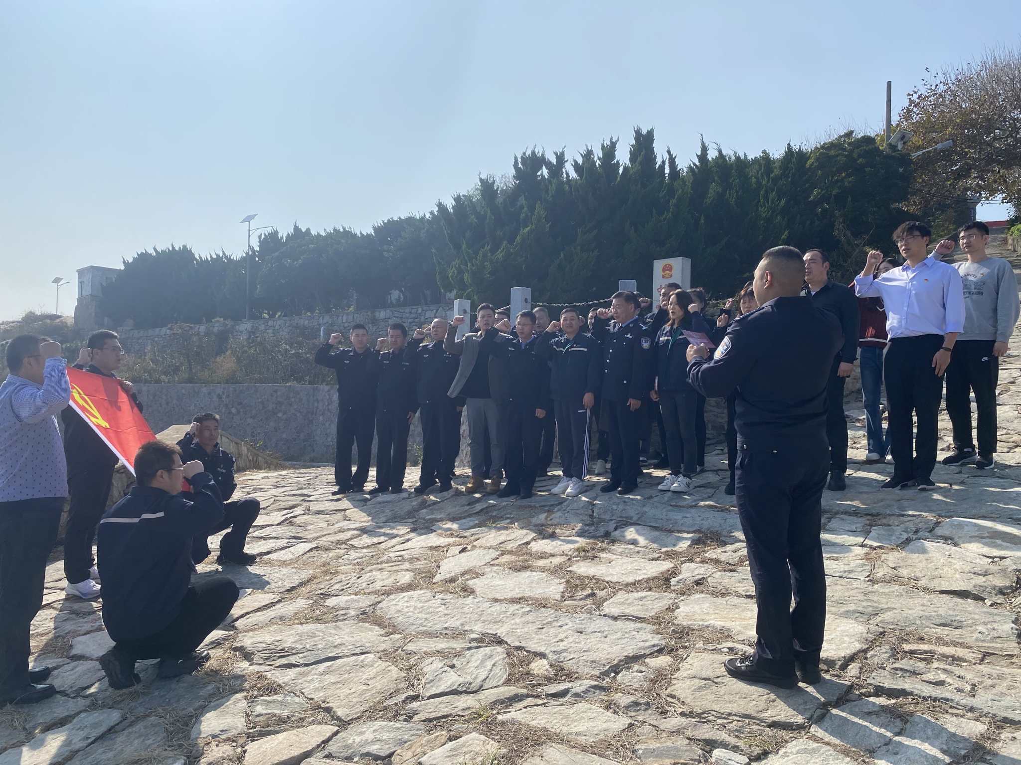 “我志愿加入中国共产党,拥护党的纲领,遵守党的章程……”在前三岛的界碑前,党员们面对鲜红的党旗,高举右拳,重温入党誓词,追忆入党初心。掷地有声的誓词,久久回荡,让每一名党员都承担起新时代的责任和担当。