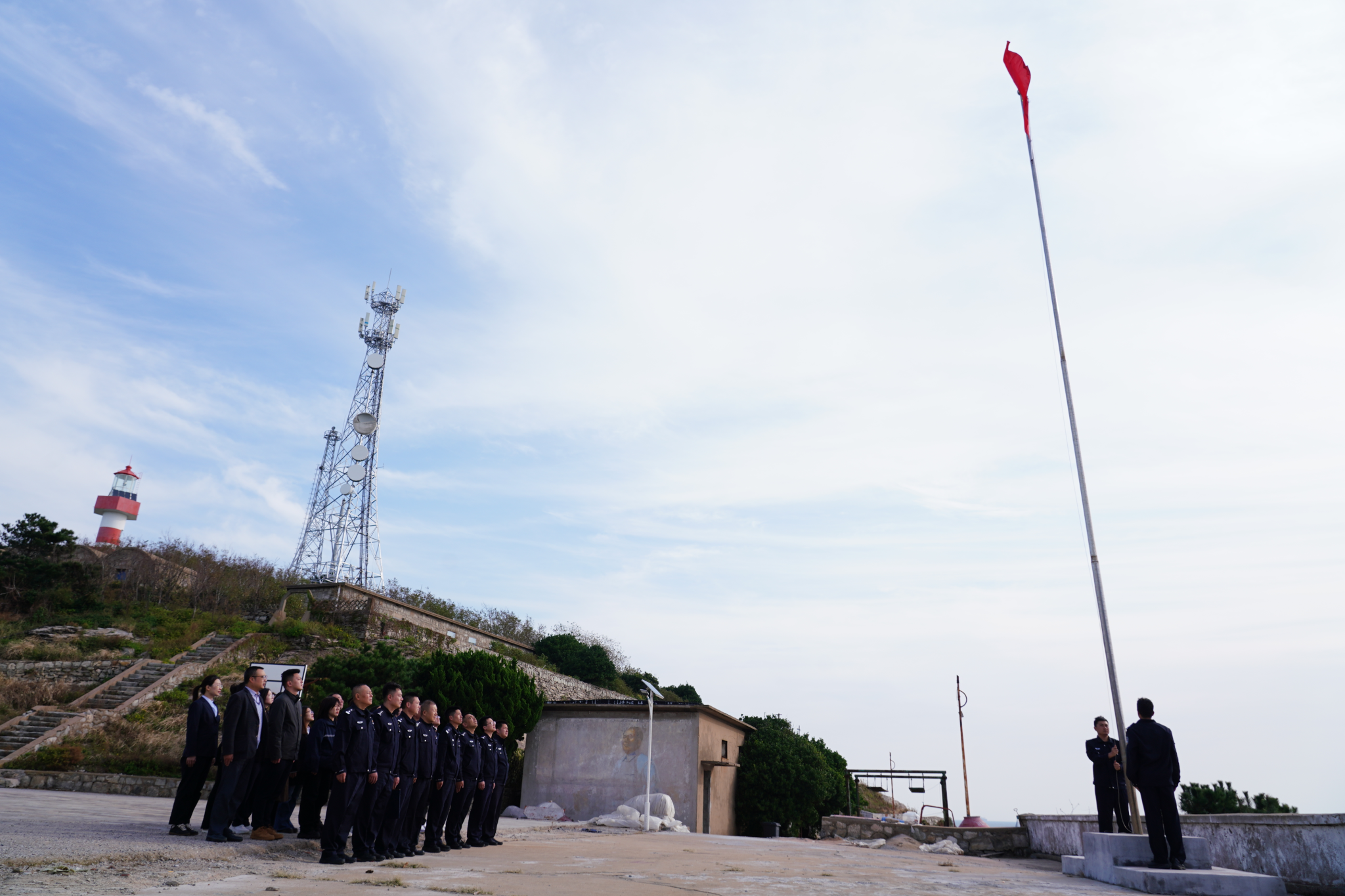 党员们身着整齐的服装,精神饱满,站成一排,面朝大海,伴随着激昂的国歌,冉冉升起的红旗在阳光的映照下格外耀眼,大家齐声高唱国歌,声音在海岸线上回荡,激荡起党员们心中的爱国情怀。