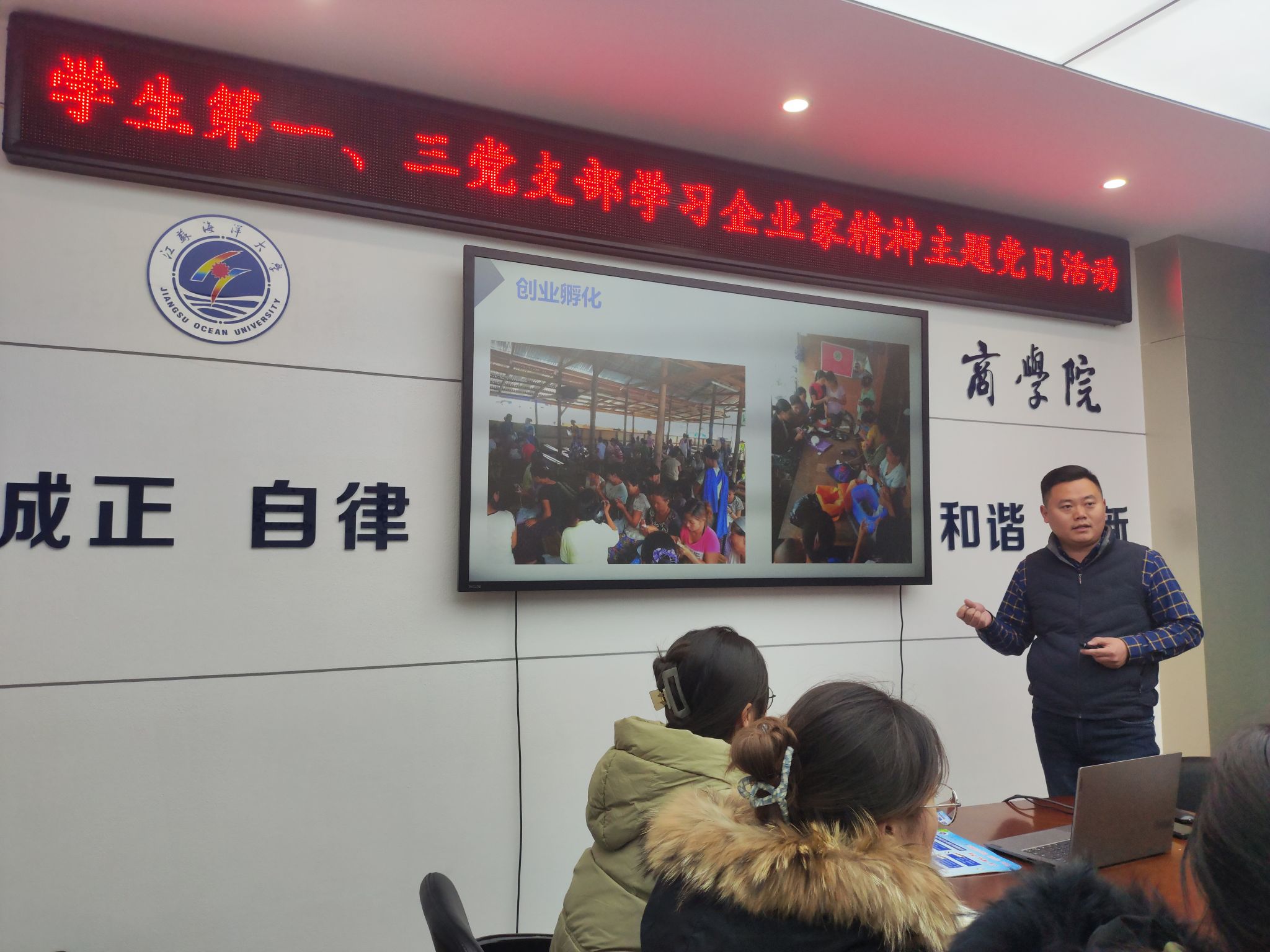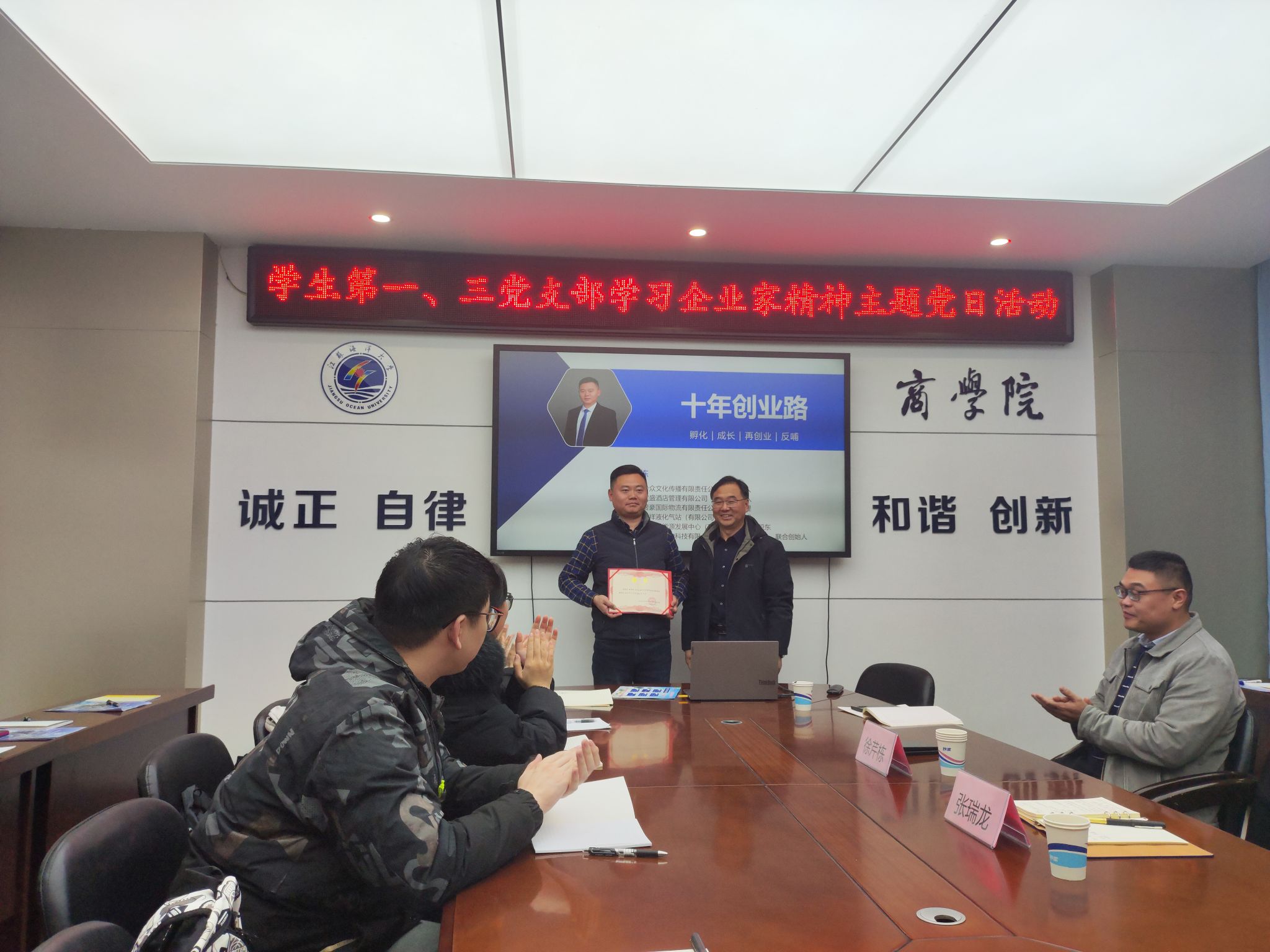 2024年12月14日,商学院学生第一、第三党支部在文渊楼355会议室举行学习企业家精神主题党日活动,此次活动邀请连云港市本土企业家徐芹栋做主讲人,商学院学生第一党支部、第三党支部全体党员同志参加了此次活动,商学院党委班子成员、副院长张瑞龙主持了此次活动。