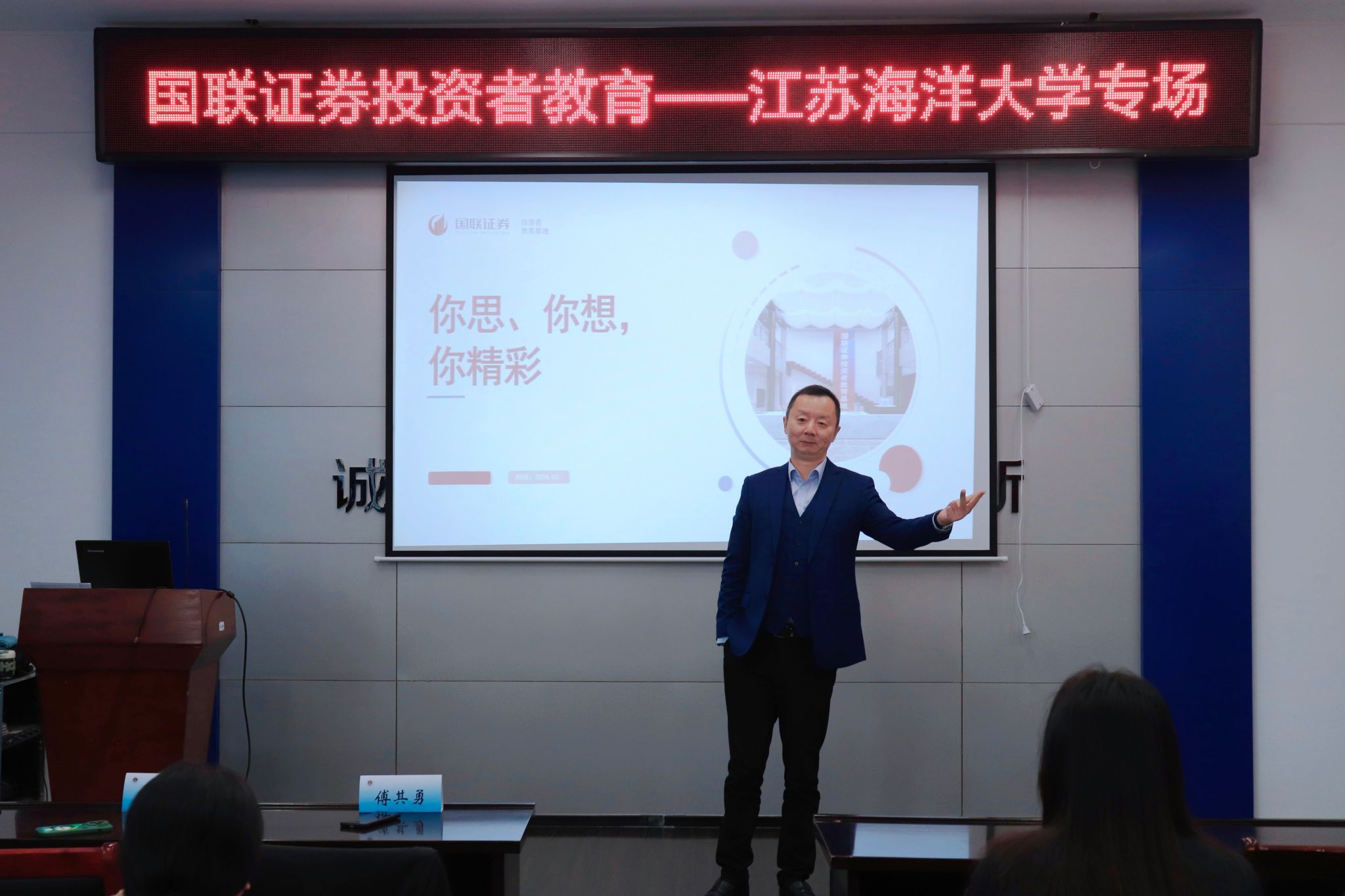 最后,国联证券财富委财富客户部负责人傅其勇为我院金融学子带来了一场“你思、你想,你精彩”的精彩报告。傅其勇认为,大学生首先要认清自我,明确自己的优势和不足,在大学期间要提升自己的沟通能力、社交能力、矛盾处理能力和应变反应能力,学会有效的时间管理和自我控制,。经历是人才的一笔财富,不断积累经验,学会总结与反思,才能不断提升自身能力,拥有在社会立足的根本。傅其勇结合其25年的丰富金融保险证券从业经历,给在场的大学生上了一场精彩的人生规划课。