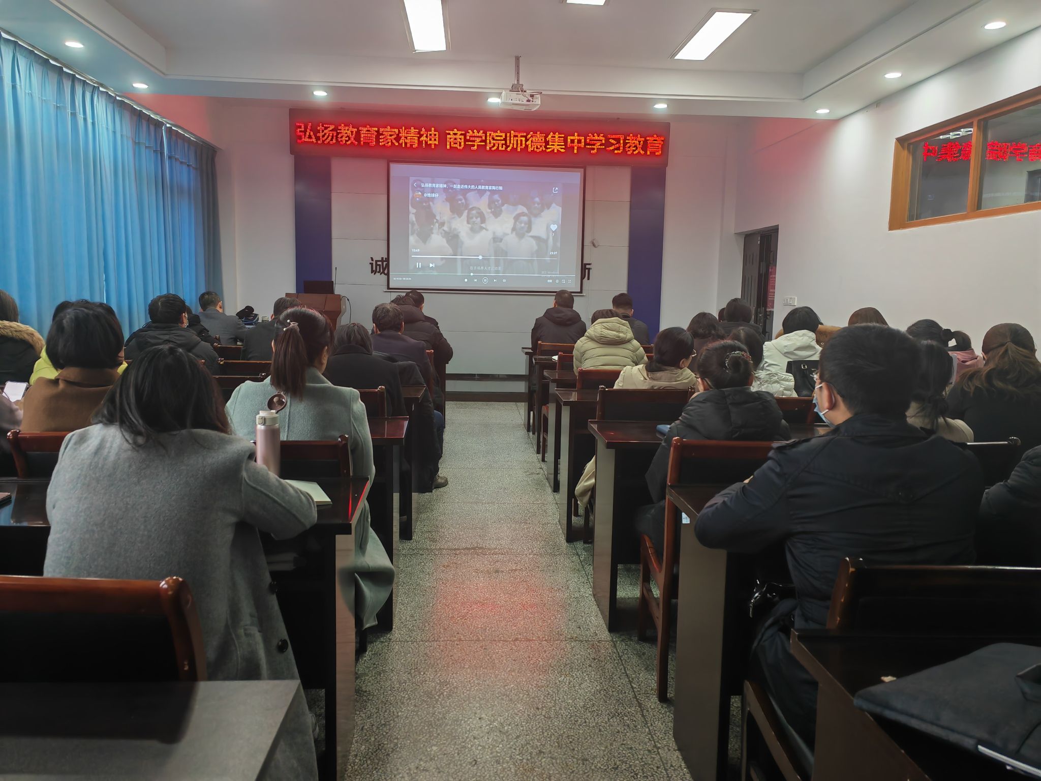 商学院党委书记万金店首先带领全体教师共同重温了习近平总书记2023年教师节前夕致全国优秀教师代表的信,学习信中对“中国特有的教育家精神”的深刻阐述及对广大人民教师的要求。接着,大家观看了“弘扬教育家精神,一起走进伟大的人民教育家陶行知”专题教育片,学习陶行知先生“捧着一颗心来 不带半根草去”的教育热忱,学习他“心有大我、至诚报国”的理想信念及将教育与实际相结合的生活教育理论。