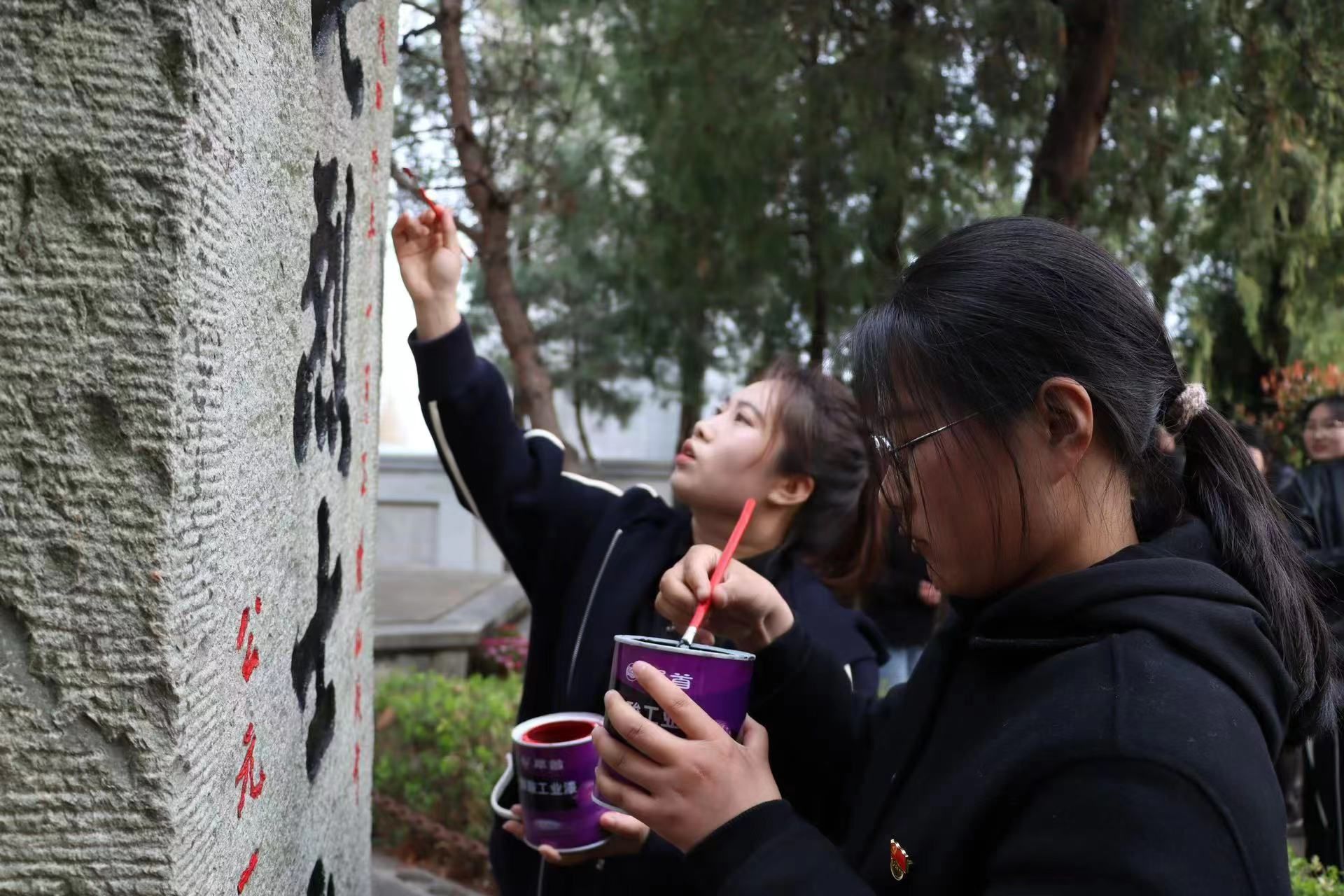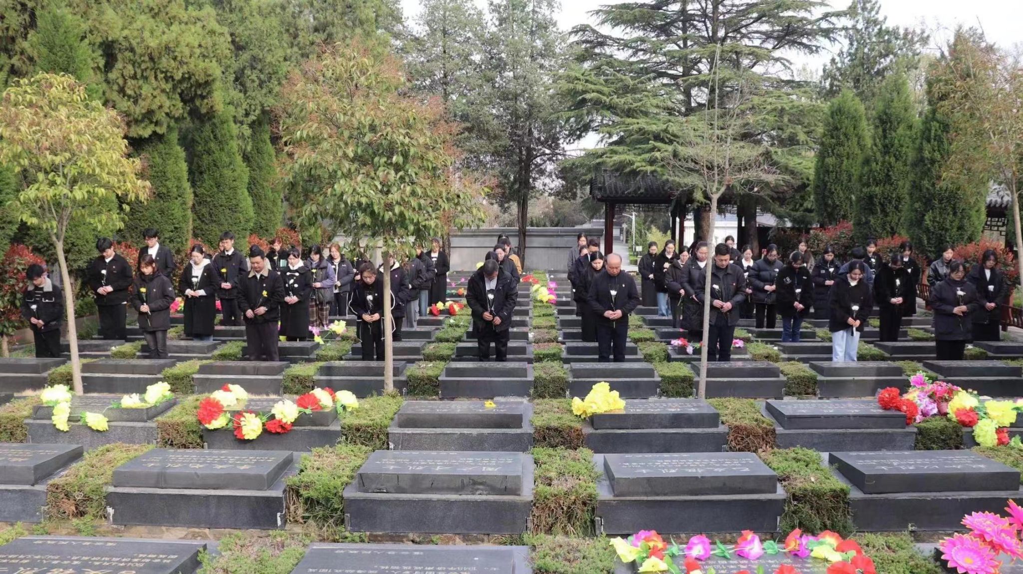 活动进入最后阶段,全体人员移步至烈士墓园。大家在行礼默哀后擦拭墓碑,并献上鲜花,依次排队为墓碑描红,表达对烈士们的敬仰与怀念。每支鲜花、每支毛笔都寄托着对烈士的深深哀思和崇高敬意。最后学生们还自发地清扫杂草等,以实际行动维护烈士陵园的整洁与庄严。