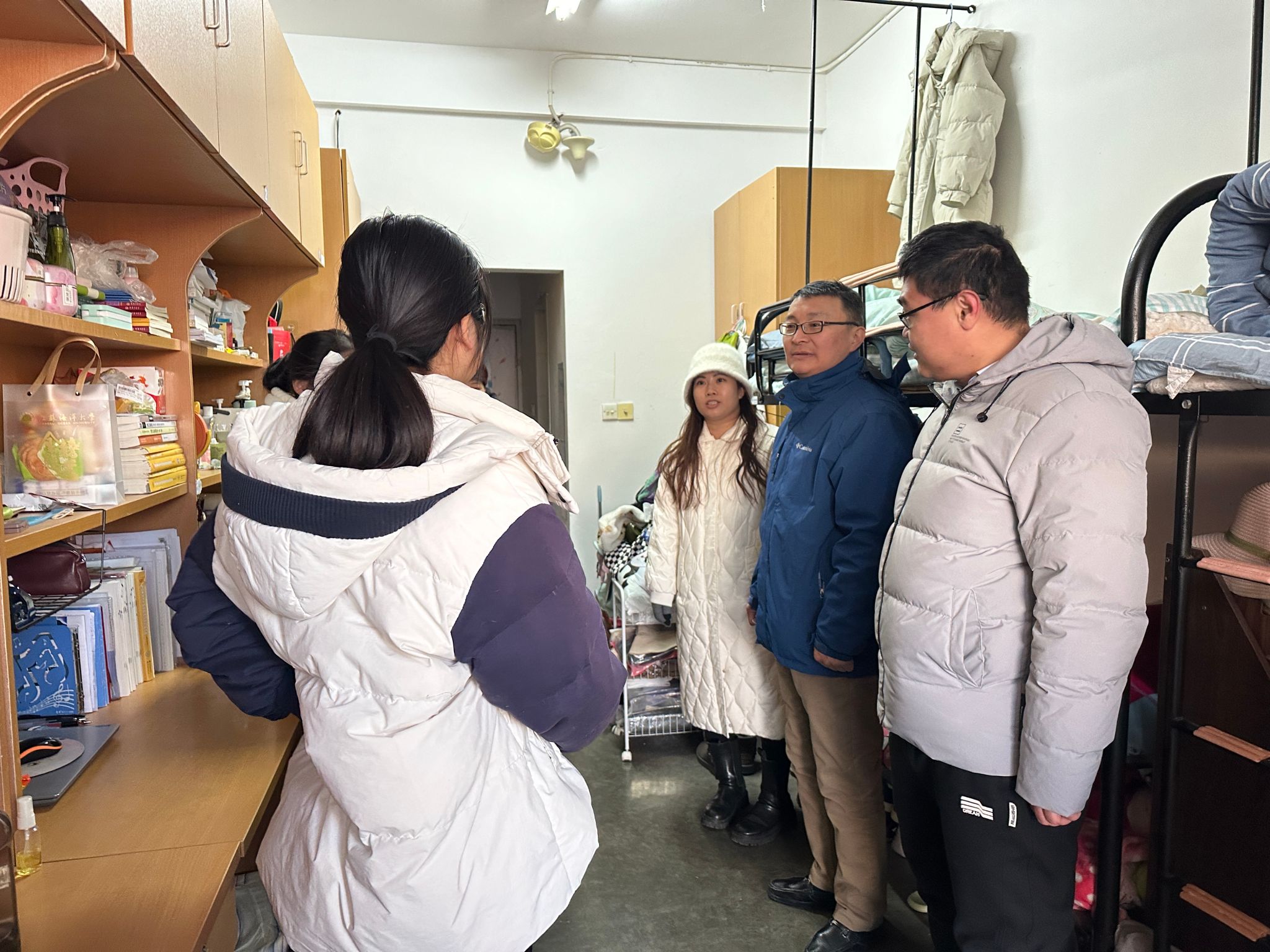 2023年12月20日,寒潮影响下天寒地冻,商学院党委副书记王智金、团委书记谭鑫、辅导员孙佳荀以及商学院学生自律管理委员会部分学生干部共同走访学生宿舍。