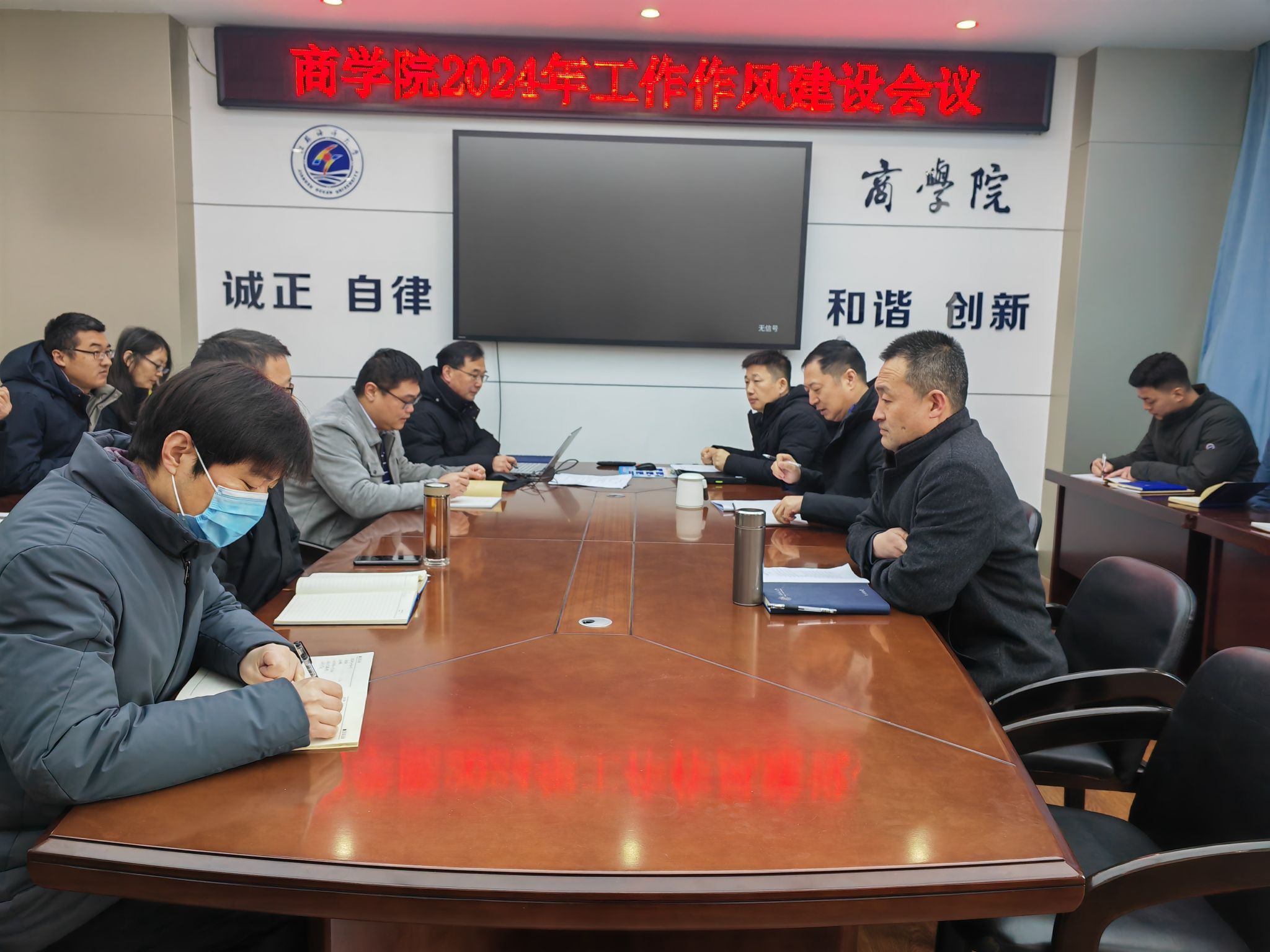 2月25日新学期伊始,商学院在文渊北楼355召开2024年度工作作风建设会议,商学院领导班子成员、系主任、支部书记及部门负责人参加,会议由院党委书记万金店主持。