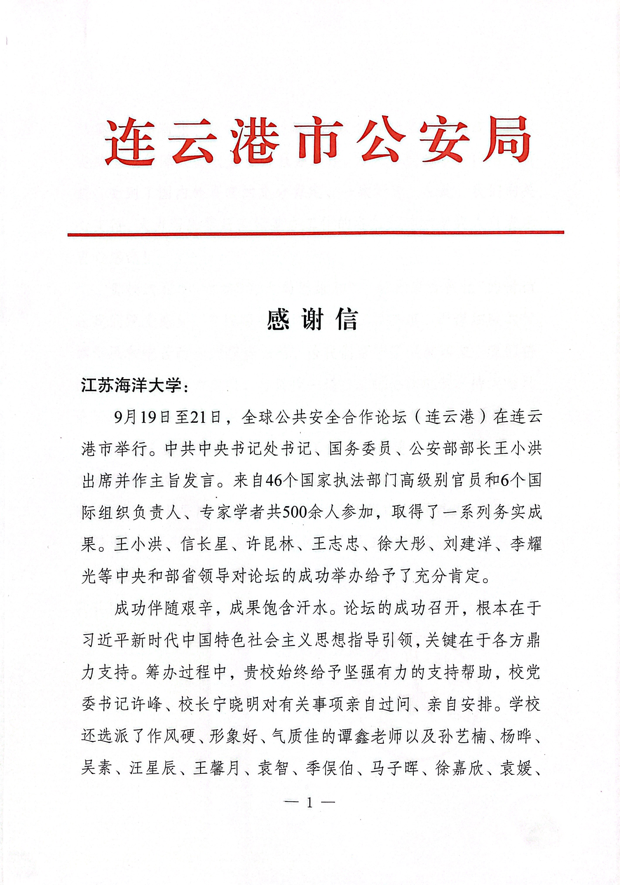 为助力论坛的顺利召开,江苏海洋大学积极配合市公安局给予强有力的帮助,校党委书记许峰、校长宁晓明对有关事项亲自过问、亲自安排。学校更选派商学院谭鑫老师和孙艺楠、杨晔等15名优秀志愿者负责大会全程前置接待服务工作。商学院师生自接受任务以来,始终保持着昂扬的精神状态,认真负责的工作态度,他们吃苦耐劳的品格得到了与会单位和人员的认可。为表示感谢,近日连云港市公安局发来感谢信,向全程保障大会前置接待服务工作的商学院青年志愿者以及对连云港公安工作和论坛建设关心支持的学校领导表示了衷心的感谢!