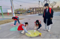 学生代表们用画笔和油漆对小广场进行布置,简单的地面逐渐变成孩子们游戏的小乐园。七彩的鱼、遨游星球的格子图……“彩绘乡村,乐享童真”,每一笔都饱含大家对孩童真挚的爱与祝福,落日余晖与孩童蹦蹦跳跳的身影勾勒出最美的剪影。