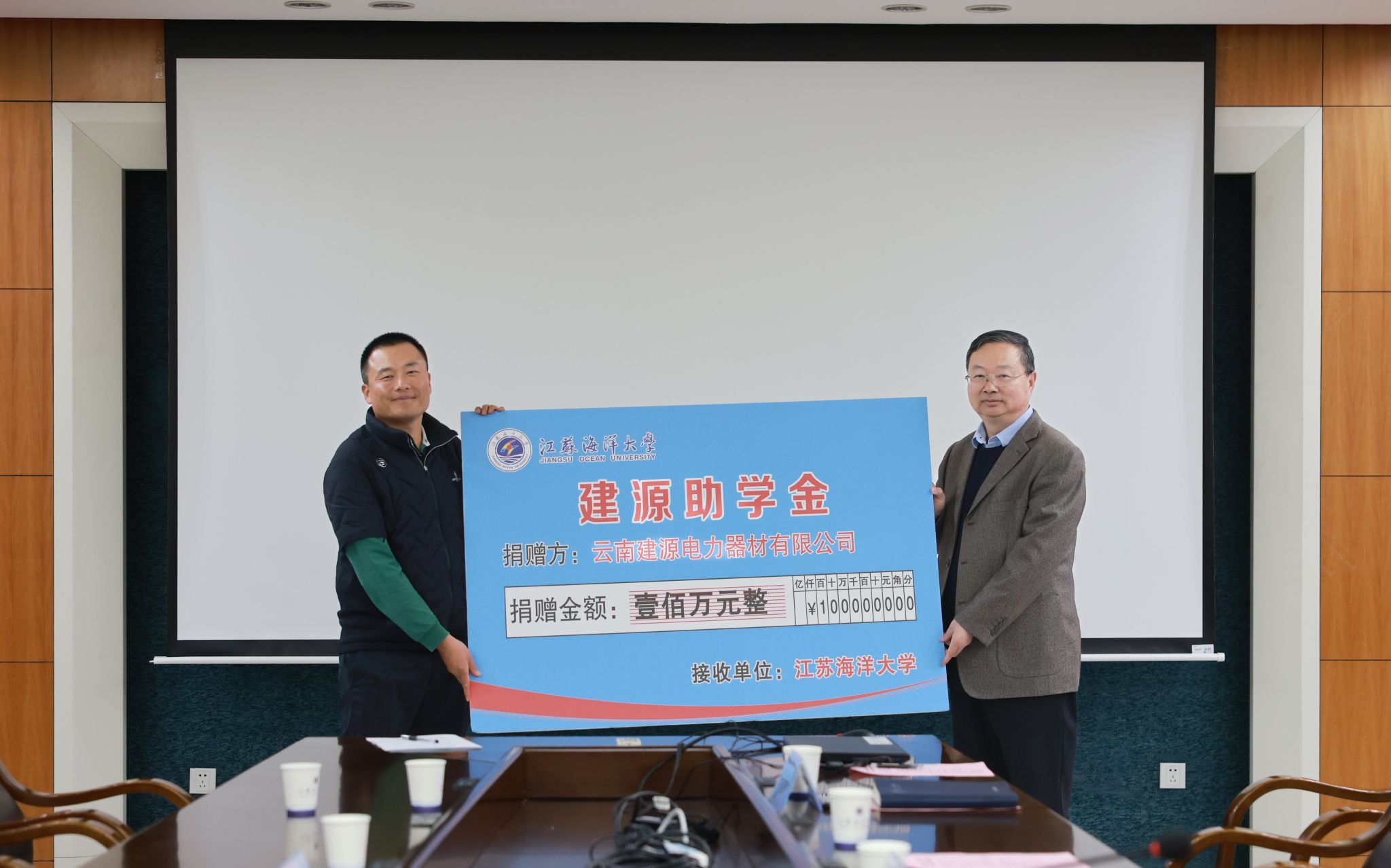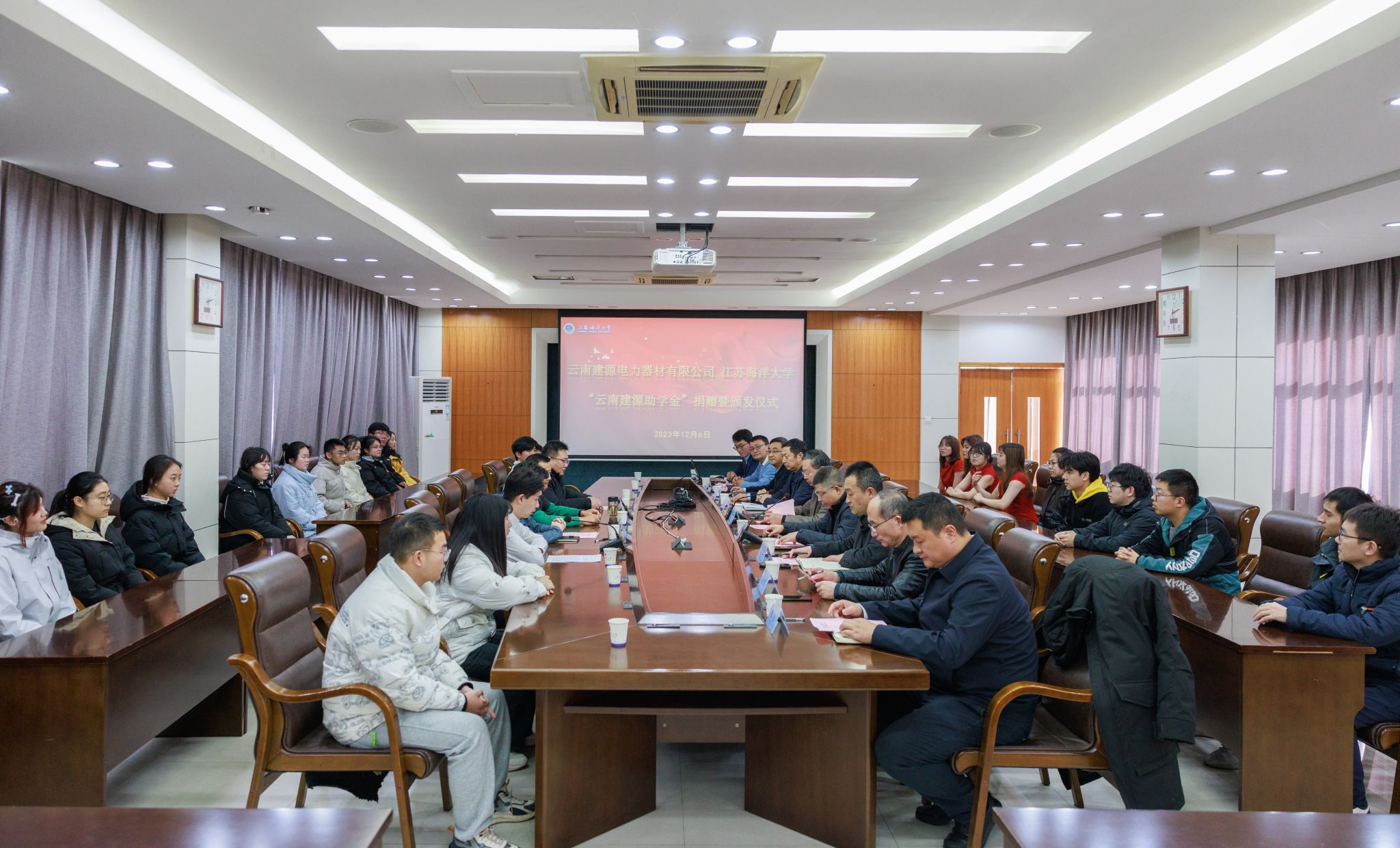 2023年12月6日下午,云南建源电力器材有限公司—江苏海洋大学“云南建源助学金”捐赠暨颁发仪式在文渊楼会议室隆重举行。捐赠人——我校商学院管理012班校友、云南建源电力器材有限公司董事长陈威,总经理助理张亚卡,江苏海洋大学校长宁晓明,副校长朱国军,学生工作处、校友工作处、商学院、计算机学院相关领导及老师,以及首批四十名获助学生参加活动。副校长朱国军主持仪式。