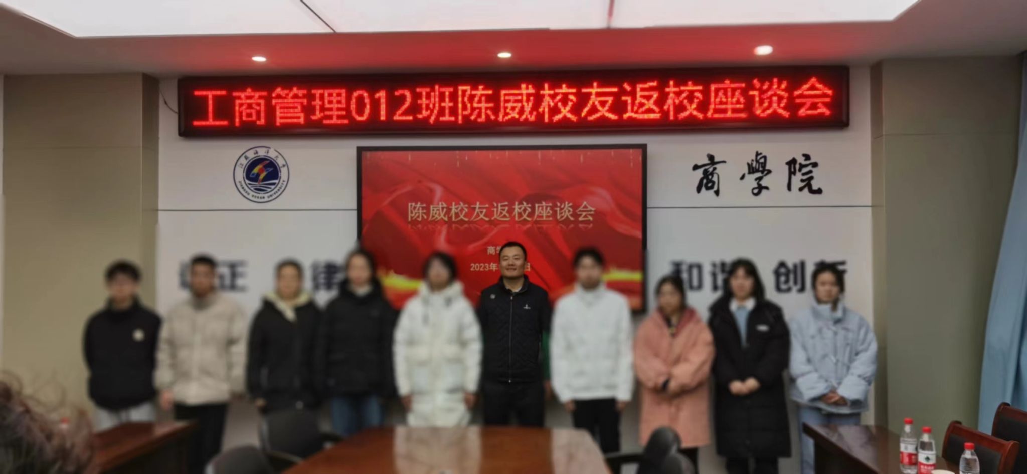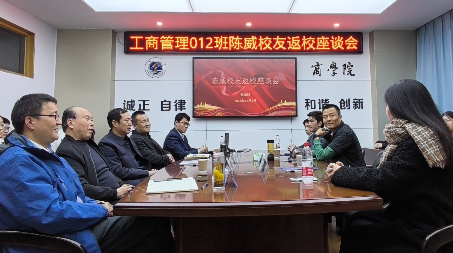 2023年12月6日下午,商学院在355会议室举办工商管理专业2001级陈威校友返校座谈会。云南建源电力器材有限公司董事长陈威、公司总经理助理、市场部副主任张亚卡,商学院党委书记万金店、院长孙军、副书记王智金,计算机学院党委副书记兰巍,工商管理系教授徐永其以及“云南建源助学金”商学院受助学生参加本次座谈会。