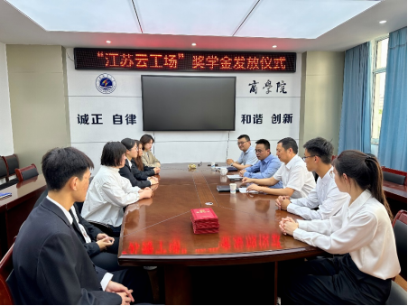 2023年6月5日下午,江苏海洋大学商学院在文渊北楼355会议室召开了“江苏云工场”奖学金发放仪式,商学院党委书记万金店、党委副书记王智金、江苏云工场信息技术有限公司副总季黎俊出席仪式。
