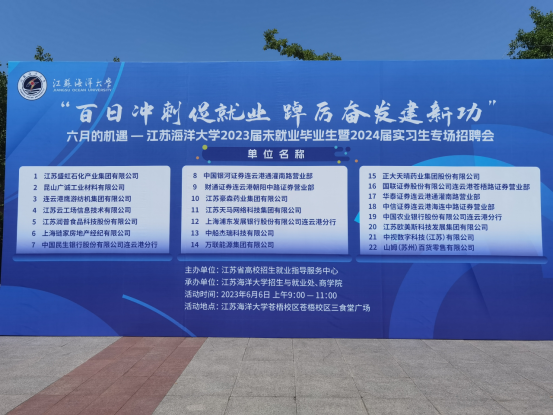 “首夏犹清和,芳草亦未歇”,在2023届毕业生即将走出校园,奋进新征程的时刻,2023年6月6日,由江苏省高校招生就业指导服务中心主办,江苏海洋大学招生与就业处、商学院承办的“百日冲刺促就业,踔厉奋发建新功”—“六月的机遇”专场招聘会成功举办。本次招聘会的目的是为贯彻落实党中央、国务院关于高校毕业生就业工作的决策部署,保障2023届毕业生高质量充分就业,同时满足广大用人单位对实习生的招聘需求,给学生提供更多更广泛的实习机会。