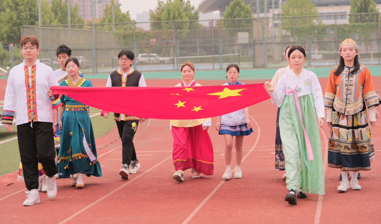 在《歌唱祖国》的歌声中,我校各族学生代表身着民族盛装簇拥着将国旗护送到国旗仪仗队手中。五星红旗伴随着雄壮的国歌冉冉升起,全体师生高唱国歌,向国旗行注目礼。