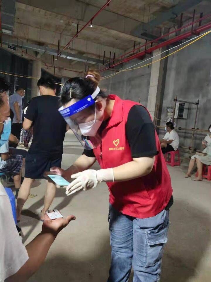 第二轮核酸检测时,社区相关负责人安排窦小典同学去核酸采集现场做扫码登记工作。此次核酸检测由于人数较多志愿工作十分艰难,不仅要仔细准确的采集登记身份证信息,还要时时刻刻提醒居民保持一米线安全距离,同时还需要调节人们紧张烦躁的负面情绪。和其他志愿者一样,窦小典同学高强度工作了将近12个小时,志愿者们都是24小时实行轮班制全程待命,这种高强度的工作还不止一次,目前江宁区已经完成六次核酸检测。