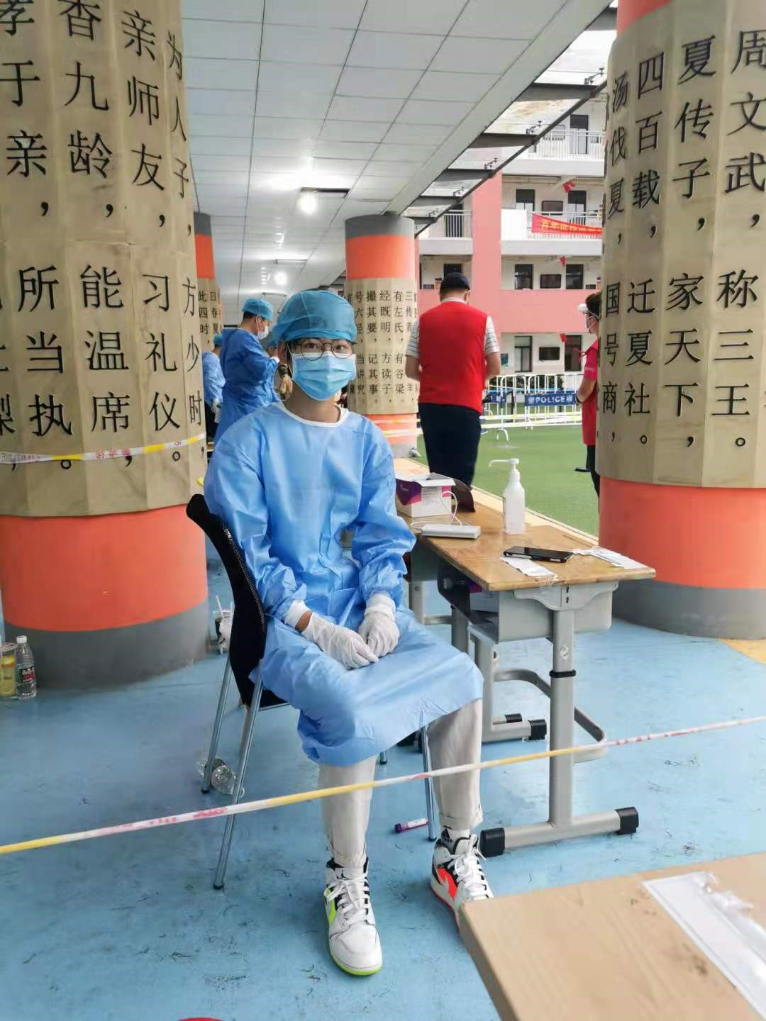 面对突如其来的南京疫情,为响应南京市委号召,耿思尧同学就近到社区报名参加南京市核酸检测志愿服务活动。耿思尧同学主要协助社区完成核酸检测工作,做好人员的登记、信息采集、维持现场秩序等。除此之外,还有一项重要的工作是帮助一些没有智能手机或者不会操作的老年人做好线上信息填写,生成每个人独有的二维码供医护人员扫描登记。尽管天气炎热,工作量很大,耿思尧同学在志愿服务时仍始终保持着积极的态度,耐心、细心地为群众答疑解惑,不怕苦不怕累,受到了医护人员的一致称赞。
