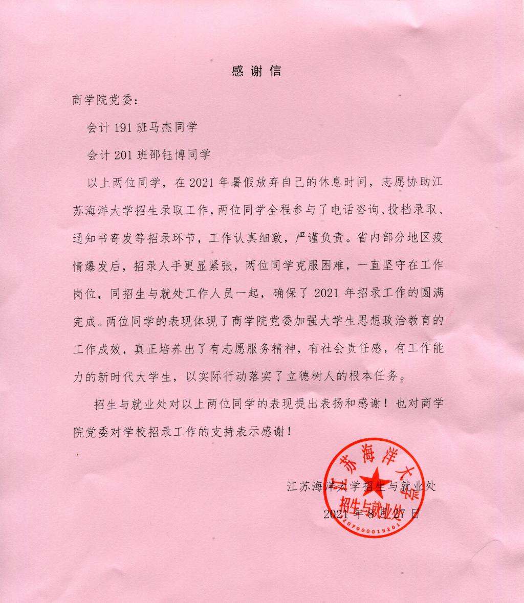 招生与就业处对以上两位同学的表现提出表扬和感谢!也对商学院党委对学校招录工作的支持表示感谢!