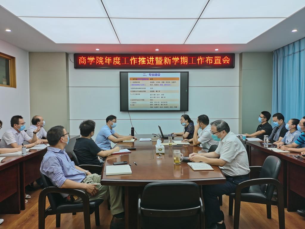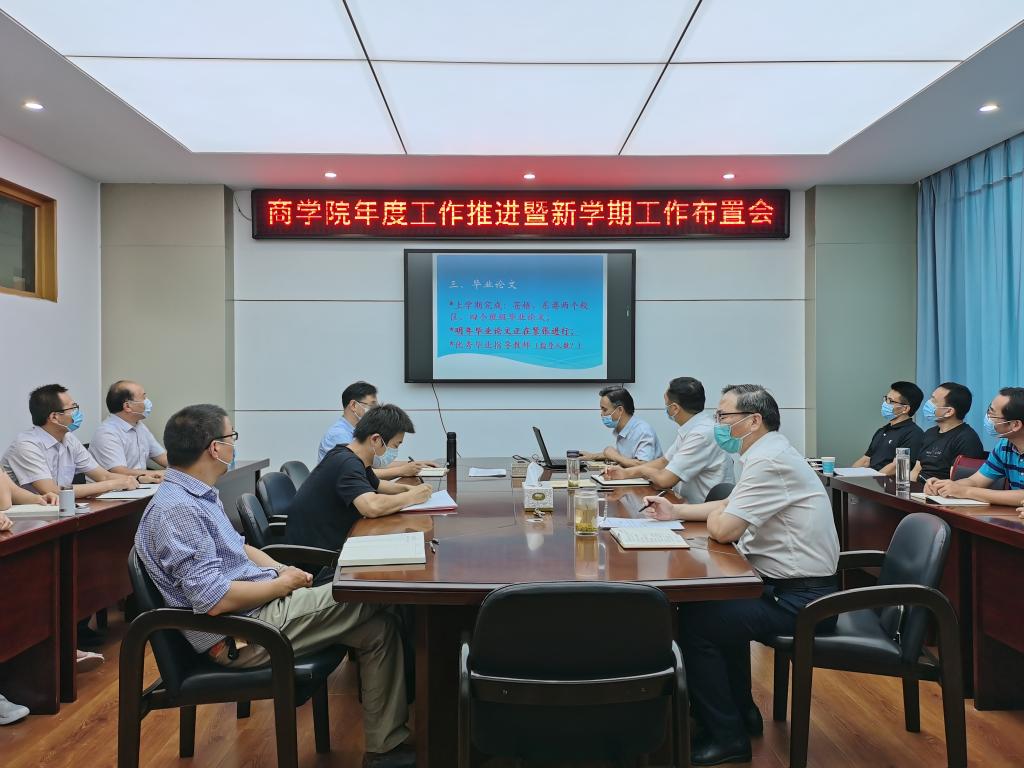 8月29日下午,商学院在文渊楼355会议室召开年度工作推进暨新学期工作布置会。院领导班子成员,系正副主任、教工党支部书记、实验中心主任和党政办主任参加会议,会议由商学院党委书记万金店主持。
