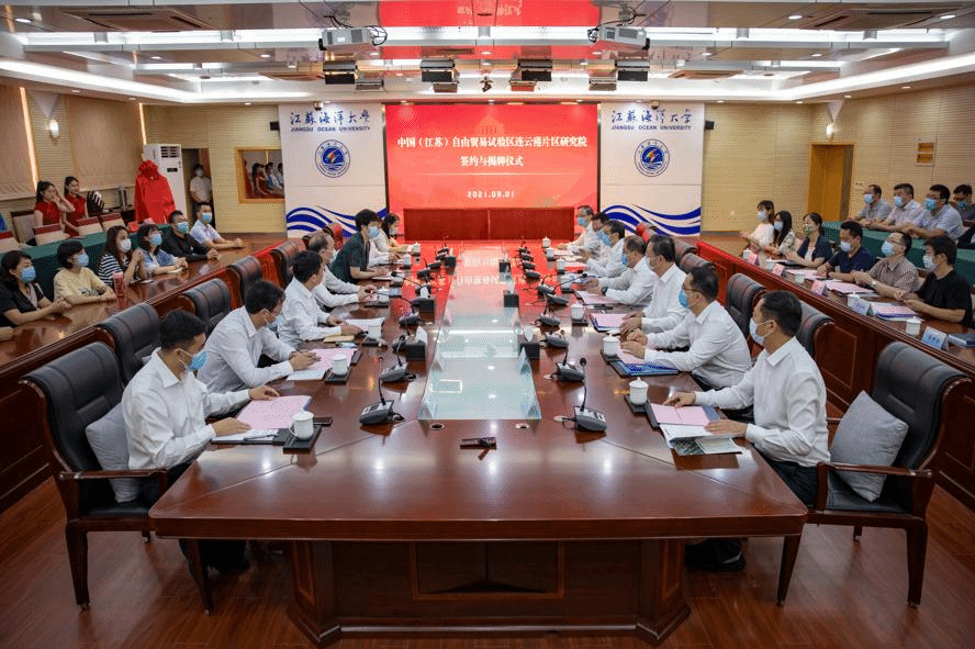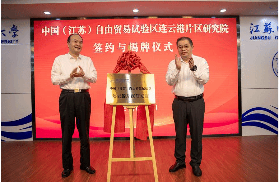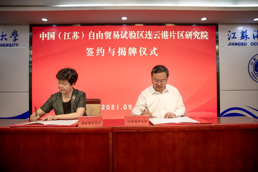 9月1日上午,中国(江苏)自由贸易试验区连云港片区研究院签约与揭牌仪式在我校学术会议中心东海厅隆重举行。校党委书记王自力与市委常委、连云港经济技术开发区党工委书记、连云港自贸片区管委会主任尹哲强共同为自贸区研究院揭牌。校长宁晓明与连云港市人民政府副市长吴海云代表双方签署合作协议。副校长许兴友出席仪式。该研究院挂靠江苏海洋大学商学院运行及管理。