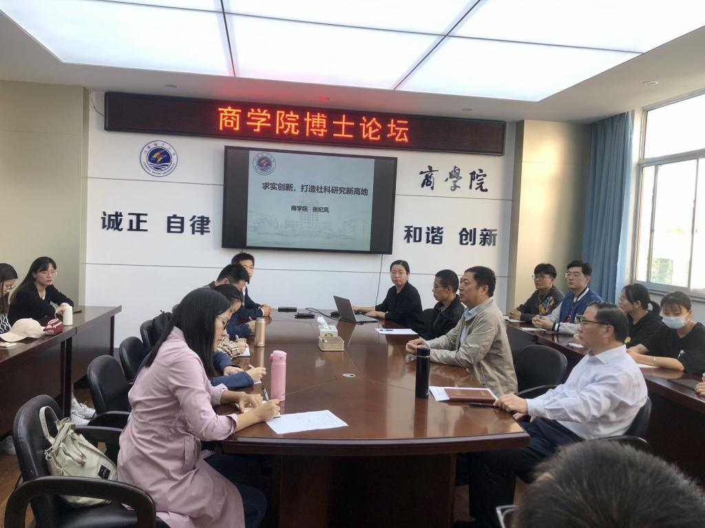 按照“两在两同”建新功行动要求,结合“我为师生办实事”实践活动要求,进一步满足新引进教师和国际商务研究生和部分本科生科研创新需求,邀请校内外科研能力强的专家学者,通过论坛、讲座、交流形式,有效提升商学院青年教师、研究生和本科生科研创新能力,10月13日下午,商学院在文渊北楼355会议室举办了商学院博士论坛,邀请商学院国际经济与贸易系张纪凤教授作为主讲嘉宾分享她的科研心得。参加本次论坛的有党委书记万金店、院长宣昌勇以及新入职博士、部分高级职称教师和部分国际商务专业硕士研究生以及本科生,论坛由翟仁祥副院长主持。