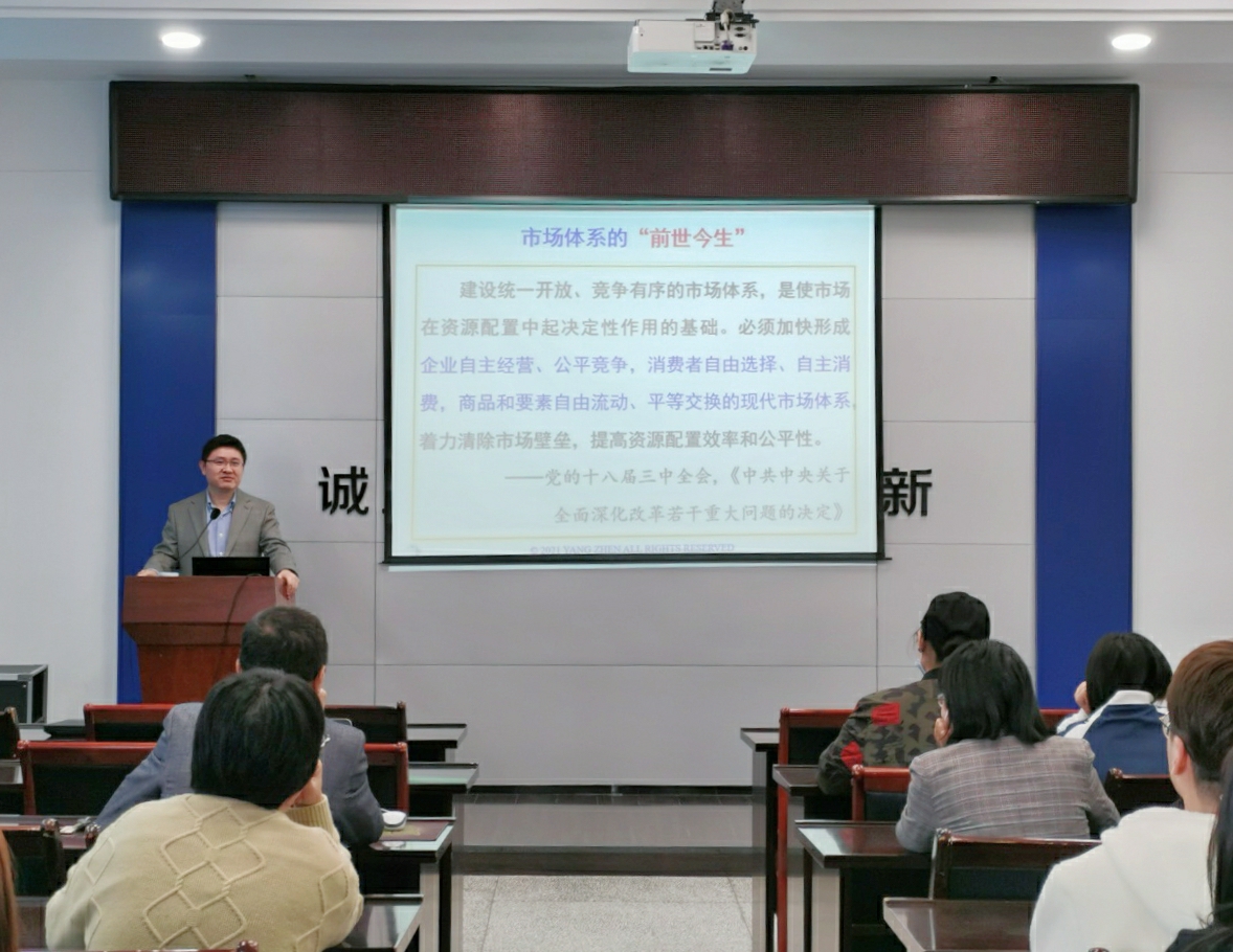 2021年10月17日上午,应商学院邀请,中共中央党校(国家行政学院)经济学教研部产业经济与经济学说史教研室副主任杨振教授在商学院357会议室作了题为“中国现代市场体系建设:主要历程与经验逻辑”的学术报告。报告会由商学院院长宣昌勇教授主持。商学院部分教师及国际商务2020级、2021级硕士研究生80余人聆听学术报告。