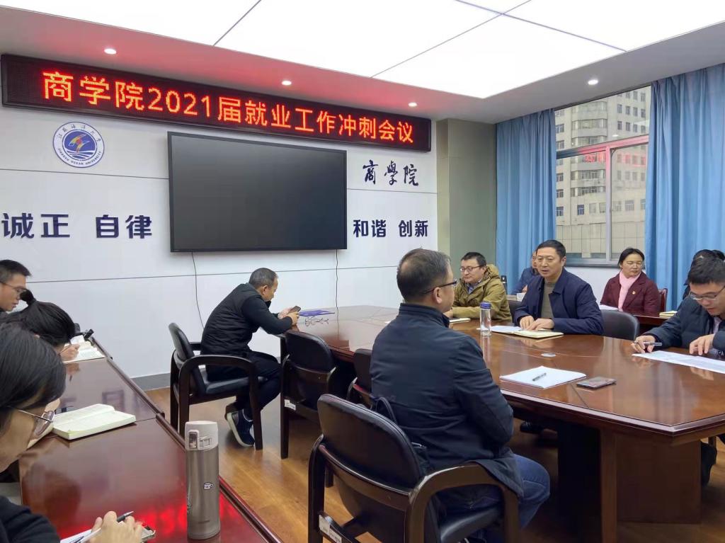 为了落实国家“六稳六保”就业工作总要求,根据校第三巡察组对商学院的反馈意见立行立改,确保压力传导到位,商学院党委于2021年11月12日召开了2021届毕业生就业冲刺工作会议。党委书记万金店、副书记王智金、2017级班主任和全体辅导员参加会议。会议由党委书记万金店主持。