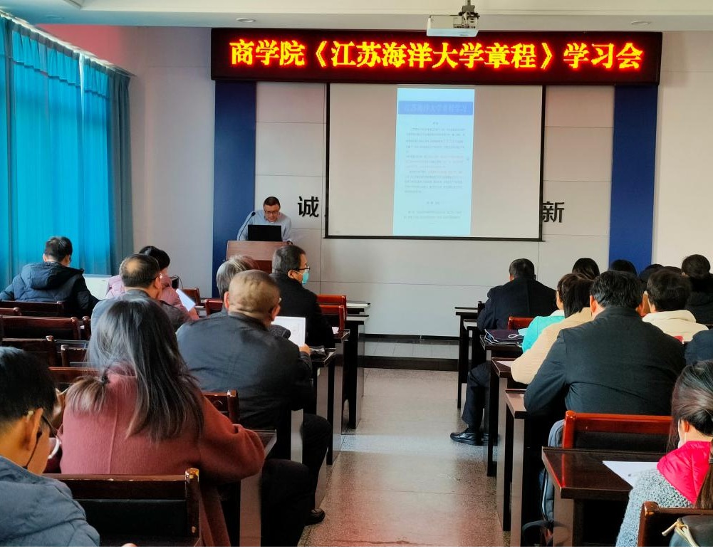 11月24日,商学院在文渊北楼357会议室集体学习了《江苏海洋大学章程》,商学院党委副书记王智金主持了学习活动。根据内容框架,王智金按照序言、总则、学校权利与义务、学生与教职工、管理体制与组织机构、财务与资产、学校与社会、学校标识与校庆日、附则的顺序进行了有重点的讲解。通过这次学习,大家理解了《江苏海洋大学章程》是落实高校依法独立办学地位和办学自主权的必要内容;是促进高校科学发展、建立现代大学制度的基本要求;是我校全面深化综合改革、切实提高办学质量、加快建设高水平应用研究型海洋大学的必然选择。商学院教职员工通过对学校《章程》的学习,进一步树立了主人翁意识、法治思维,激发了投身学校事业的积极性和主动性。