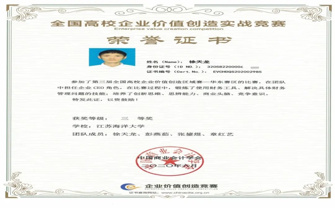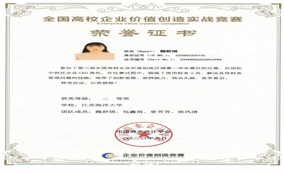 2020年6月13日,第三届全国高校企业价值创造区域赛华东区域赛落下帷幕。经过激烈角逐,由易爱军、戴华江老师指导的江苏海洋大学代表队从华东地区127支参赛队伍中脱颖而出,会计专业魏舒琪、包鑫宇、曾芳芳、庾凤清赛组成的参赛队获得了华东赛区二等奖,徐天龙、彭燕茹、张鋆煜、章红艺四位同学组成的参赛队获得了华东赛区三等奖的好成绩。