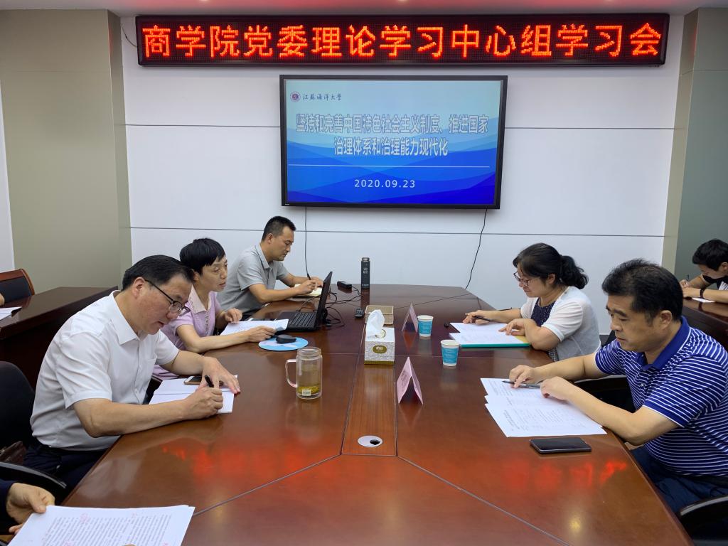 9月23日下午,商学院党委理论学习中心组围绕“坚持和完善中国特色社会主义制度、推进国家治理体系和治理能力现代化”主题开展了专题学习,校巡学旁听第四工作组组长、校党委常委、党委组织部部长纪延光和党委宣传部理论教育科科长卢娟莅临指导,商学院党政领导班子、党委委员、各系主任、党支部书记参加了会议。会议由学院党委书记杨天华主持。