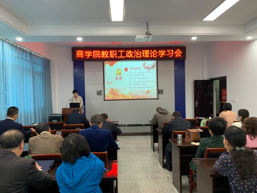 10月14日下午,商学院在355会议室举行教职工政治理论学习会,商学院党政领导班子成员、全体教职工参加了会议,会议由商学院党委书记杨天华主持。