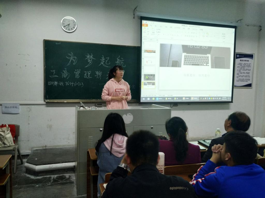 王雨戈同学首先用精美的PPT展示了协会的历史、协会的性质、部门结构、部门成员以及日常事务活动。他特别支出商学院未来管理者协会的核心工作是提升学生的专业思想,增强学风建设,为同学们构建看得见的职业道路。