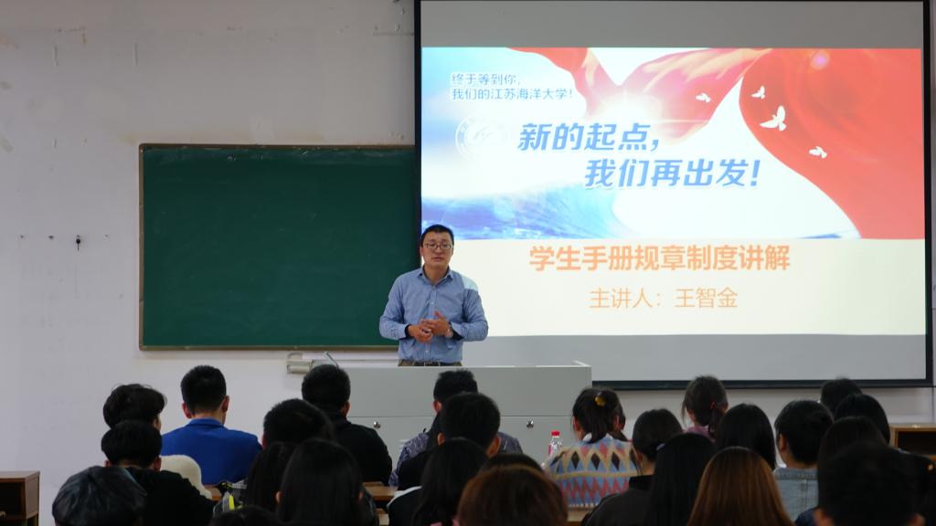 在进行学生手册讲解之前,王智金书记提及了关于校园贷、网贷、电信诈骗等网络风险以及由家庭纠纷引起的学生负面情绪等问题,对大学生的身心健康表示关心。他建议大学生要提高自我意识,隔绝负面情绪,构筑自己的心理防线,并且告诫大学生不要挥霍自己的青春,而是将这四年的青春有效抓在自己手中。