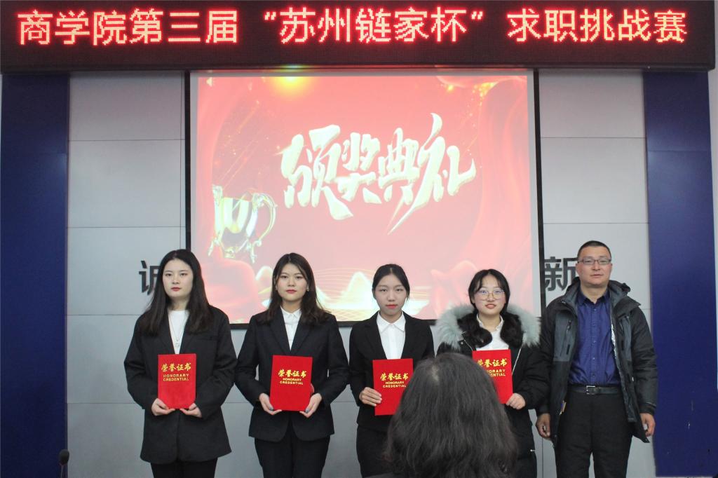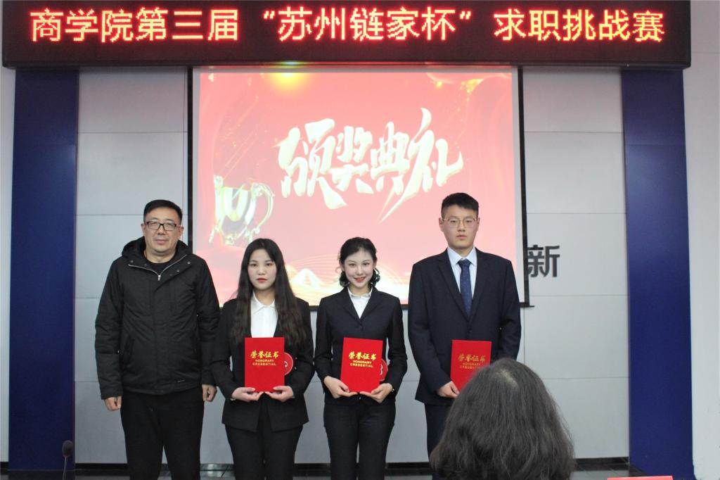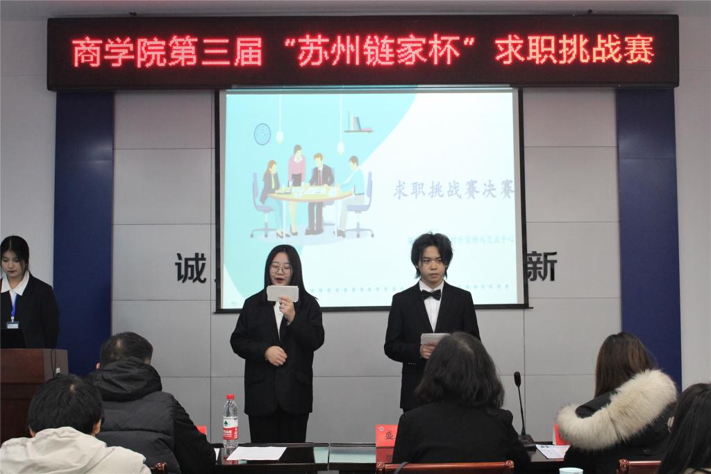 2020年12月13日下午三点,由商学院主办、商学院学生会对外宣传与交流中心承办的第三届“苏州链家杯”求职挑战赛决赛于苍梧校区文渊楼357顺利举办。经过前期的筛选,共有9名优秀的商学院学生成功入围决赛,担任此次比赛评委的是苏州链家公司招聘经理盛庆龄、招聘主管段美婧、王琳以及江苏海洋大学就业指导中心主任骆海宏、江苏海洋大学商学院党委副书记王智金。