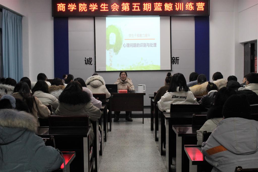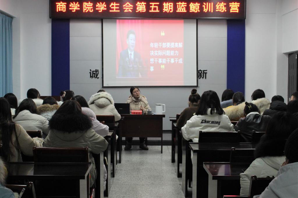 2020年12月18日下午五点,商学院第五期蓝鲸训练营学生会成员培训活动于苍梧校区文渊楼357顺利举行。本次活动诚邀文法学院学生工作办公室副主任蒋莹莹老师担任主讲人,培训对象为商学院学生会主要学生干部。