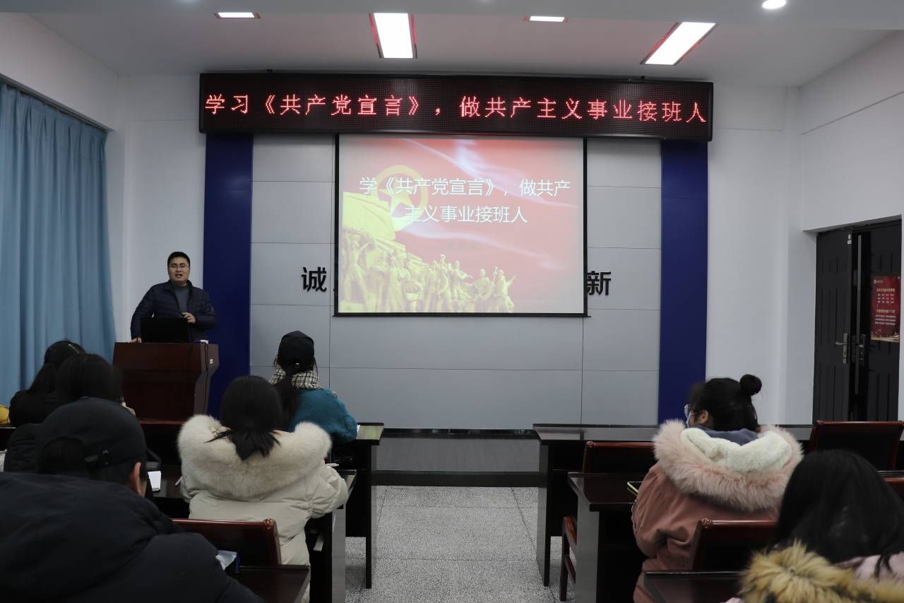崔老师抛出“大家是否读过《共产党宣言》?”和“如何领会青年马克思主义工程?”两个问题,激发起同学们探究的热情,从诞生、基本内容、历史背景和历史意义等角度具体介绍了《共产党宣言》这部历史著作。他指出马克思、恩格斯于1848年公开发表的《共产党宣言》,是全世界共产党人的精神家园,也是全世界共产党人奋斗的初心和原点。它标志着科学社会主义的诞生,为无产阶级的解放事业提供了强有力的理论武器。此外,他通过《共产党宣言》的第一句“一个幽灵,共产主义的幽灵,在欧洲游荡。”向学员们展现出《共产党宣言》通俗易懂的一面。《共产党宣言》为当代中国共产党人坚定理想信念、保持发展定力、强化使命担当、始终拒腐防变,夺取中国特色社会主义新胜利提供了无穷的力量源泉。崔老师强调,学生干部作为学生中的领头羊、思想上的引路人,更应该读一读《共产党宣言》,常怀家国情怀、坚定社会意志,为国家、社会的发展壮大不断奋斗。最后,他以马克思的格言“在科学上没有平坦的大道,只有不畏艰险沿着陡峭山路攀登的人,才有希望达到光辉的顶点。”寄语同学们,对待任何事情,都不能采取浅尝辄止、蜻蜓点水的态度,而应下大气力、下苦功夫,掌握马克思主义基本原理和贯穿其中的立场、观点、方法,并结合具体实践不断创新和发展。