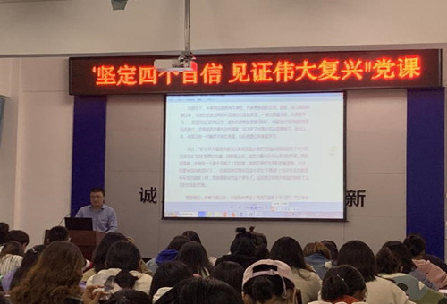 2019年10月23日,商学院举办了“坚定"四个自信" 见证伟大复兴”主题党课,本次党课是按照“不忘初心、牢记使命”主题教育活动的要求进行的,由商学院党委副书记、工商管理学生党支部书记王智金主讲。