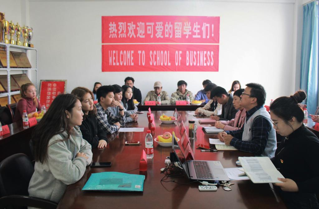 10月30日下午,商学院在文渊楼355会议室举办留学生见面会。商学院党委书记杨天华、党委副书记王智金以及国际交流与合作处、国际学院辅导员董鸿洋出席会议。会议由党委副书记王智金主持,全体商学院留学生参加了见面会。