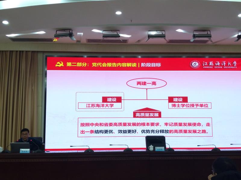 12月25日下午,商学院、艺术学院在黄海厅开展了教职工理论学习,校党委办公室、校长办公室主任郑利军应邀做了《着眼新时代要求 推进高质量发展——学习贯彻学校第四次党代会精神》的辅导报告。报告会由商学院院长宣昌勇主持,商学院和艺术学院全体教职工参加了报告会。