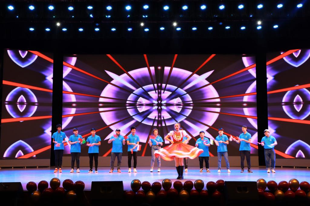 晚会的第二章-奔赴蔚蓝海洋心由歌曲《仰望星空》开始,真挚演绎了商院女排不畏挑战,顽强拼搏的事迹。背景视频中,女排姑娘们刻苦训练和拼搏参赛的情景深深感动了众人。小品《大山师恩》用诙谐的表演让观众们捧腹连连,留学生倾情演绎的舞蹈《四海风韵》又让大家沉浸在了热烈的异域风情之中。表演间隙,工作人员向观众随机派发金鼠玩偶,向同学们送去鼠年的第一份祝福,晚会现场一片欢腾。