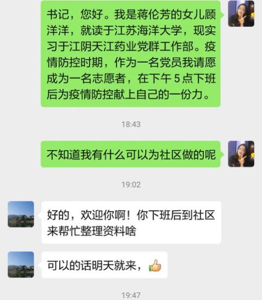 顾洋洋在2019年12月与天江药业签订了就业协议,并在公司党群工作部实习。从1月25日至2月8日在家远程办公期间,顾洋洋利用“天江药业党建”微信公众号共发布19篇推文。她说:“面对疫情我能做的不多,作为实习生我要认真做好领导安排的宣教工作,让公司广大员工认识到做好自身防护的重要性。”