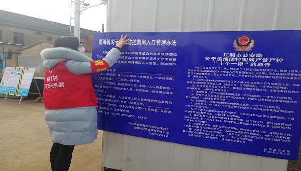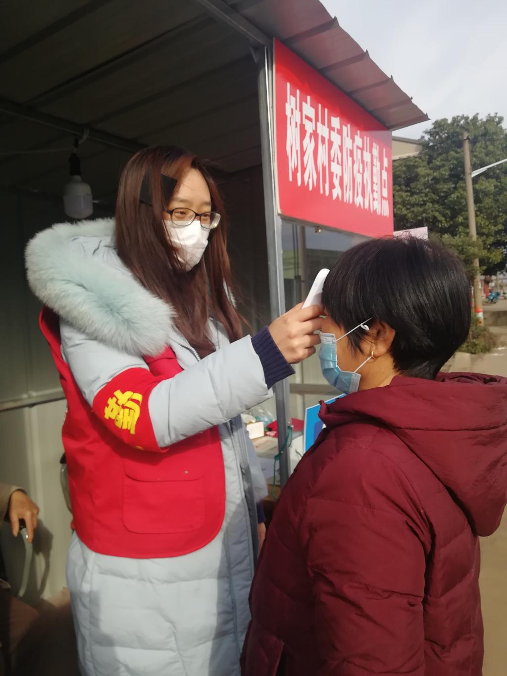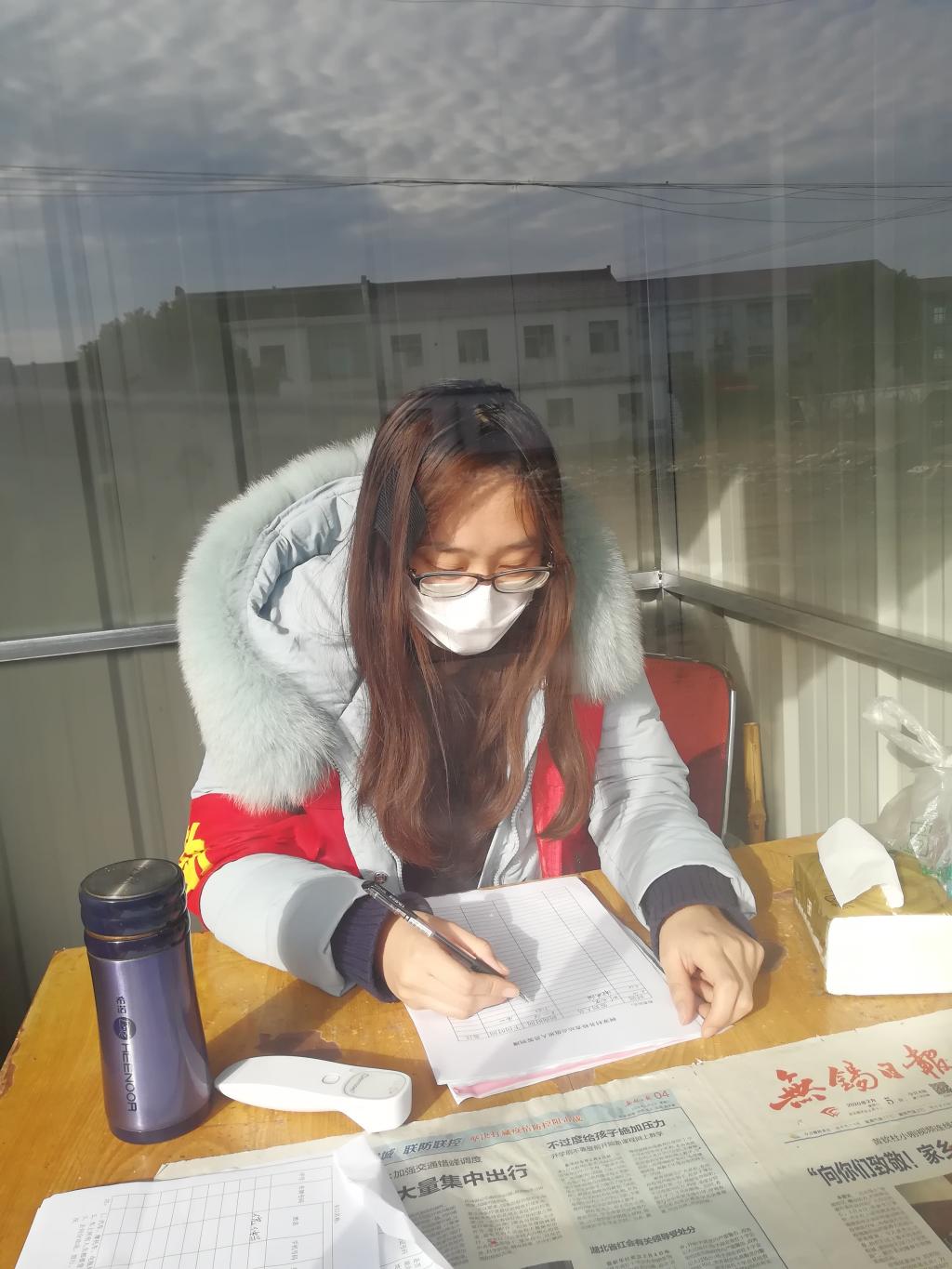当看到网上日益严重的疫情,以及镇上物资和人力短缺,谢旻阳同学主动去村委会,用自己的新年压岁钱捐款了1000元,并成为一名社区志愿者。早上,她都会提前到防疫执勤点,与上一个班次的志愿者完成交接工作。进行一系列的防护防护工作后,开始人员登记工作,挨个给通行者量体温,消毒以及疫情宣传。有时也与社区党员干部一起,对隔离用户进行情况调查,普及疫情防控知识。做到让居民安心,尽力阻断疫情传播。