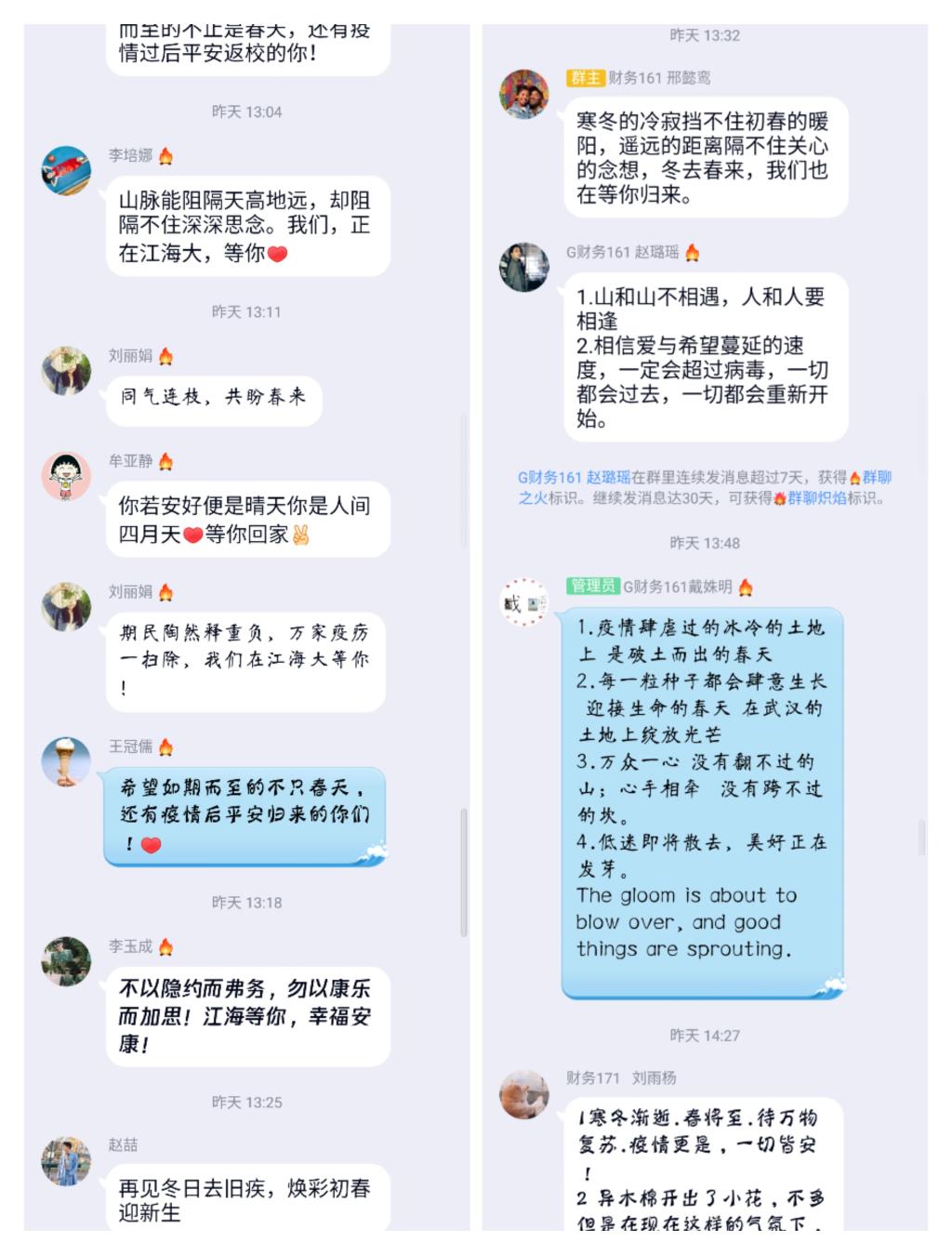 支部书记周智超首先与财务管理专业滞留湖北的同学进行了视频通话,将目前国内的防疫形式、学校的防疫措施等情况进行了详细介绍,安抚了学生焦虑的情绪,解答了学生的疑问。支部成员们纷纷通过QQ群对湖北同窗送去了祝福和问候,并期待他们归来。