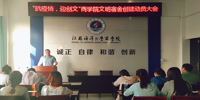为提升商学院宿舍环境,做好疫情防控,营造美好校园氛围,配合做好连云港城市创文工作,2020年5月21日,商学院在文渊楼会议室召开了“抗疫情,迎创文”文明宿舍创建动员大会。商学院党委副书记王智金,全体辅导员、学生党员、商学院学生自律管理委员会成员参加了动员大会。