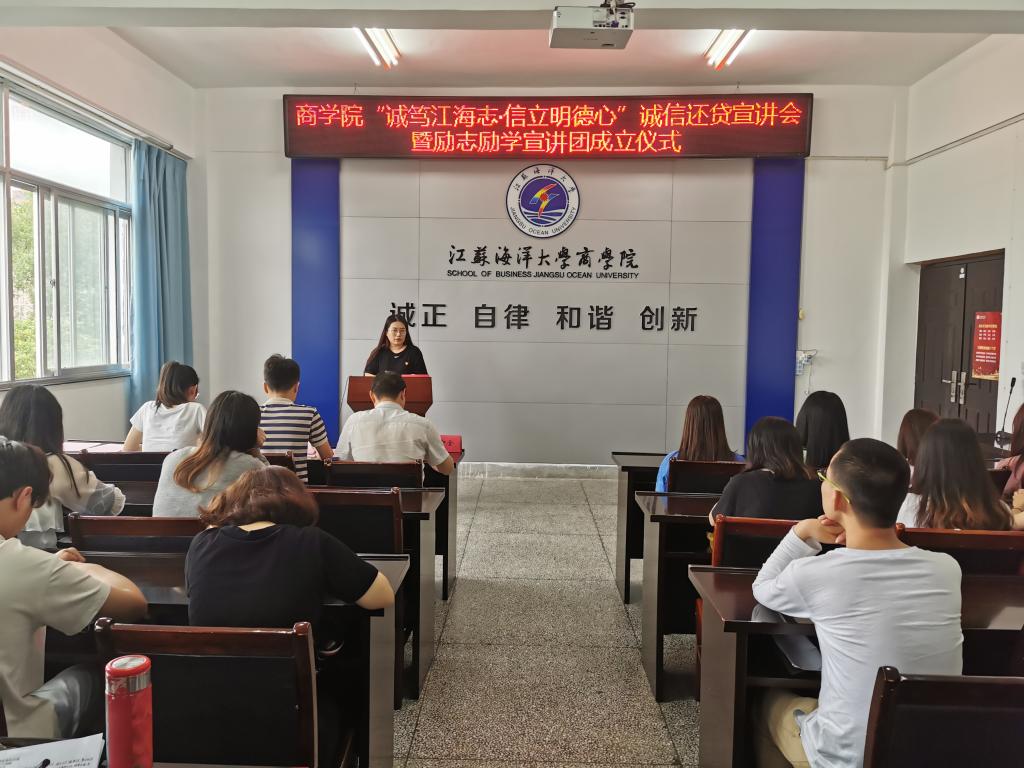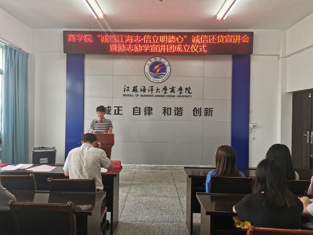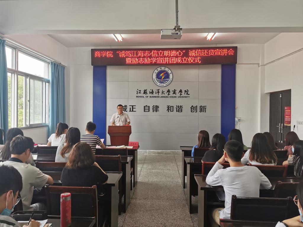 为更好的宣传国家助学贷款及其他资助政策,普及征信知识、金融知识、如何使用支付宝还款等事项,倡导契约精神,促使学生树立诚信观念,商学院于6月18日15点在江苏海洋大学文渊楼359会议室举行“诚笃江海志·信立明德心”诚信还贷宣讲会暨励志励学宣讲团成立仪式。商学院党委副书记王智金出席会议。