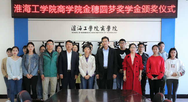 近日,商学院2018年“金穗圆梦奖学金”颁奖仪式在商学院会议室隆重举行。中国农业银行连云港苍梧支行党委书记、行长孙献忠、苍梧支行行长助理曹娟、苍梧支行综合管理部总经理陈联中,商学院党委书记杨天华、商学院党委副书记王智金出席了仪式。商学院团委副书记李淑华主持仪式。