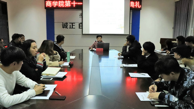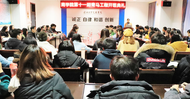 12月4日,商学院第十一期“青马工程”培训班开班仪式在苍梧校区主楼606举行,“青马工程”全名为青年马克思主义者培养工程,目的是提高学生干部的思想政治意识,培养中国特色社会主义事业的合格的建设者和可靠接班人。商学院党委书记杨天华、党委副书记王智金、团委副书记李淑华、全体辅导员老师以及本期学员参与了本次开班仪式,仪式由李淑华老师主持。
