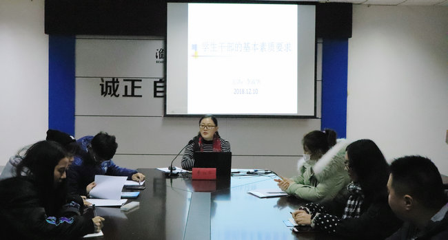 为进一步加强商学院学生干部队伍建设,提升学生干部的技能水平和专业素质,12月10日下午5时,商学院第十一期青马工程第三次培训于主楼606顺利举行。此次培训会主题为“学生干部的基本素质要求”,由商学院团委副书记李淑华老师主讲,第十一期青马工程全体学员参加。